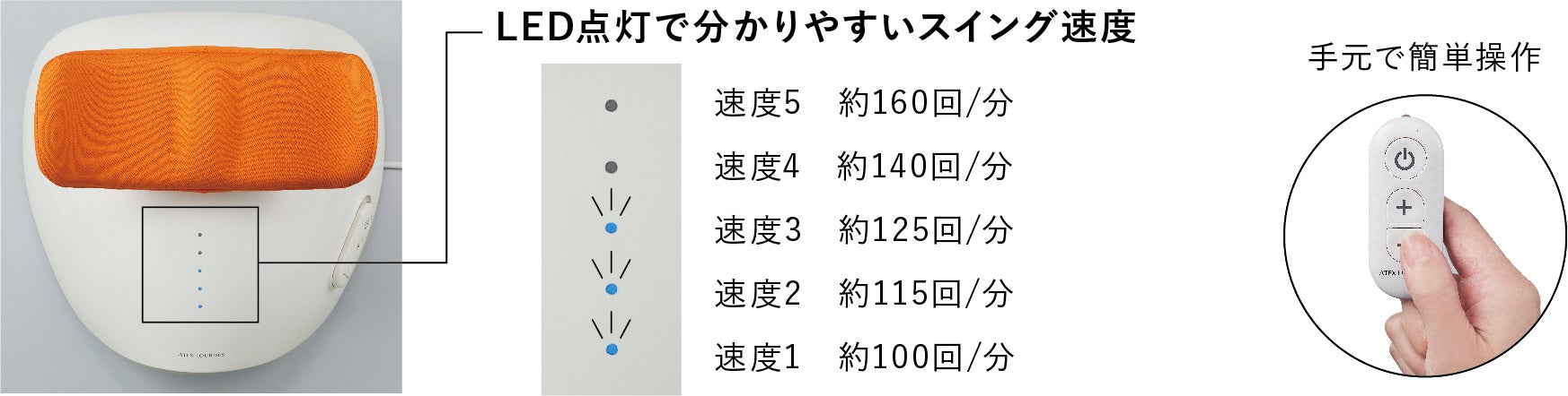 スイング速度は5段階で調節ができます。低速でゆれる速度1(約100回/分)から、高速でゆれる速度5(約160回/分)まで、体調や慣れに応じて選ぶことができます。付属のリモコンで操作でき、調節することができます。スイング速度はLED点灯で表示します。