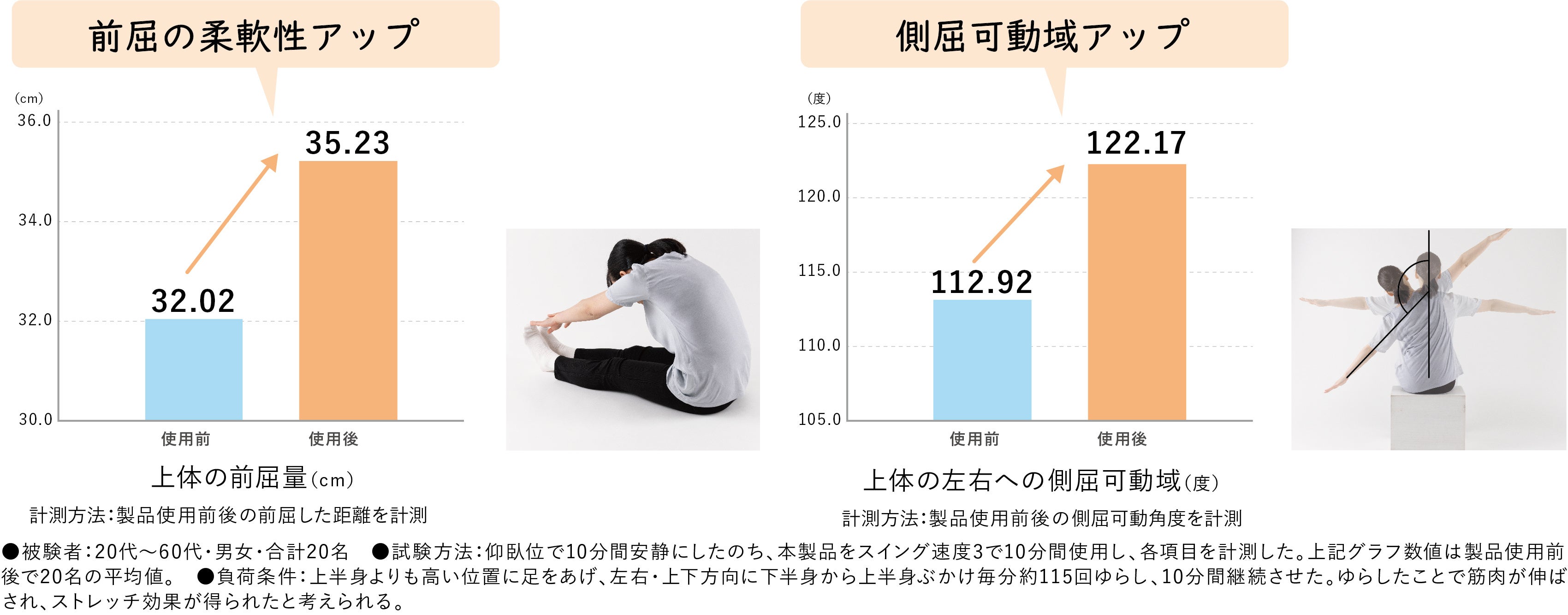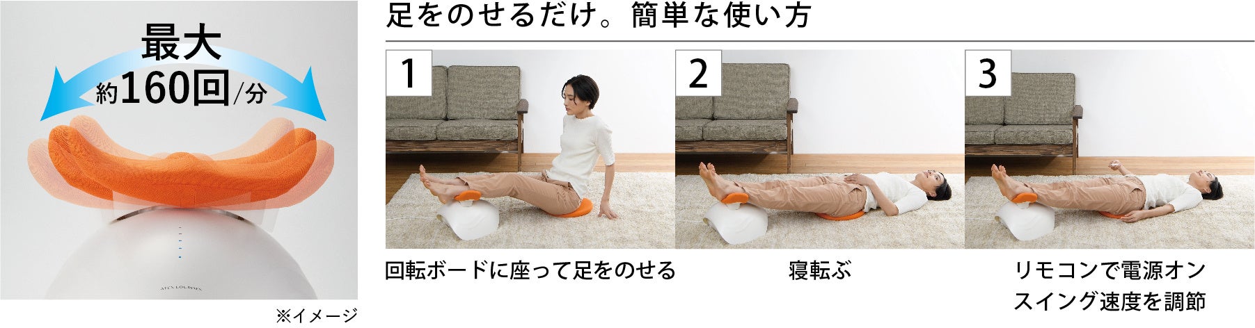 人は歩くことで足を前後に動かしますが、左右方向に動かすことはあまり多くありません。本製品は左右方向へ足をゆらし、日ごろ伸ばしていない筋肉にアプローチして伸縮させます。メトロノームのように円弧を描きながら足を左右・上下に大きくゆらします。上下の動きも加わることで体にひねりが入り、日常生活では動かしにくい筋肉を伸縮させます。