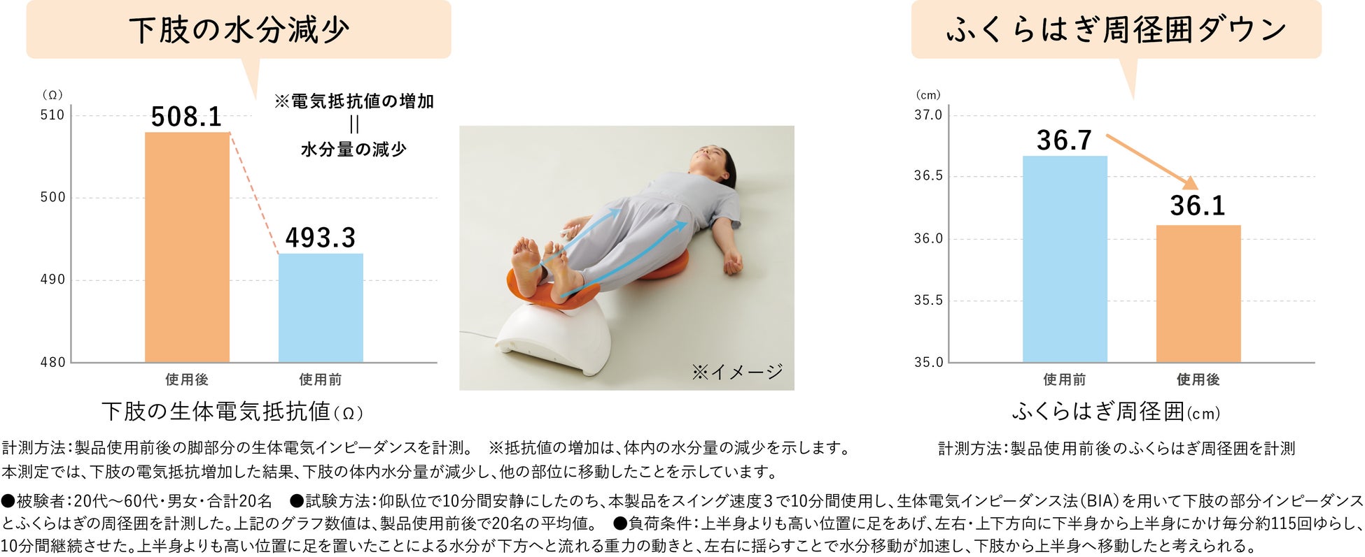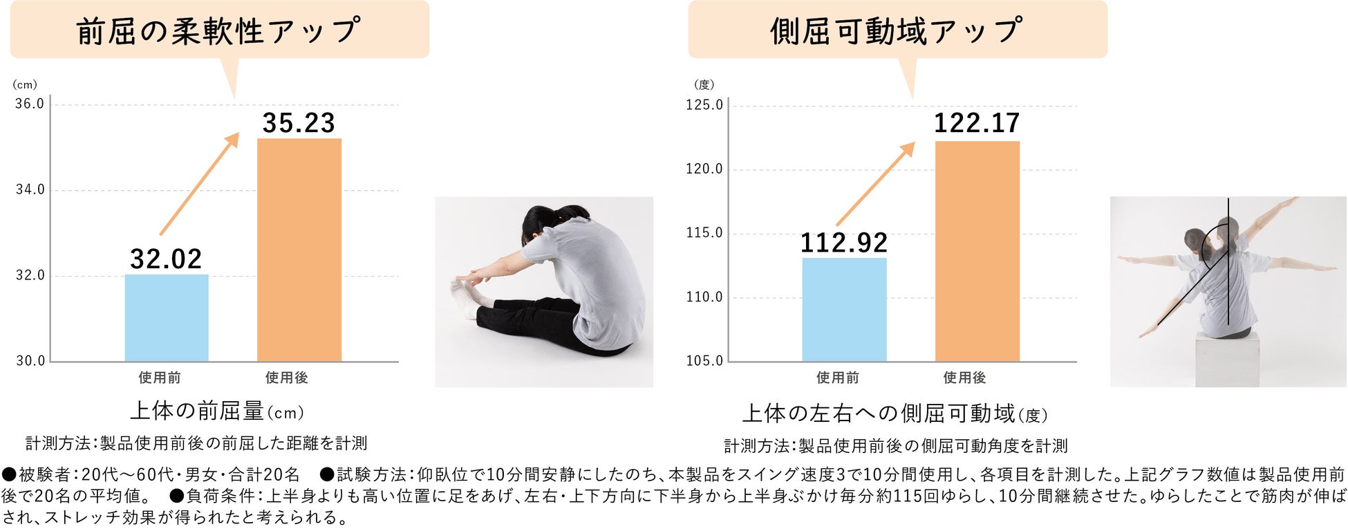 20人に使用前後の検証試験を実施し、歩行(速度・歩幅・歩数)、下肢の水分量、柔軟性の変化を確認しました。結果、各項目において有意性がある効果が出ました。詳細は検証結果をご覧下さい。