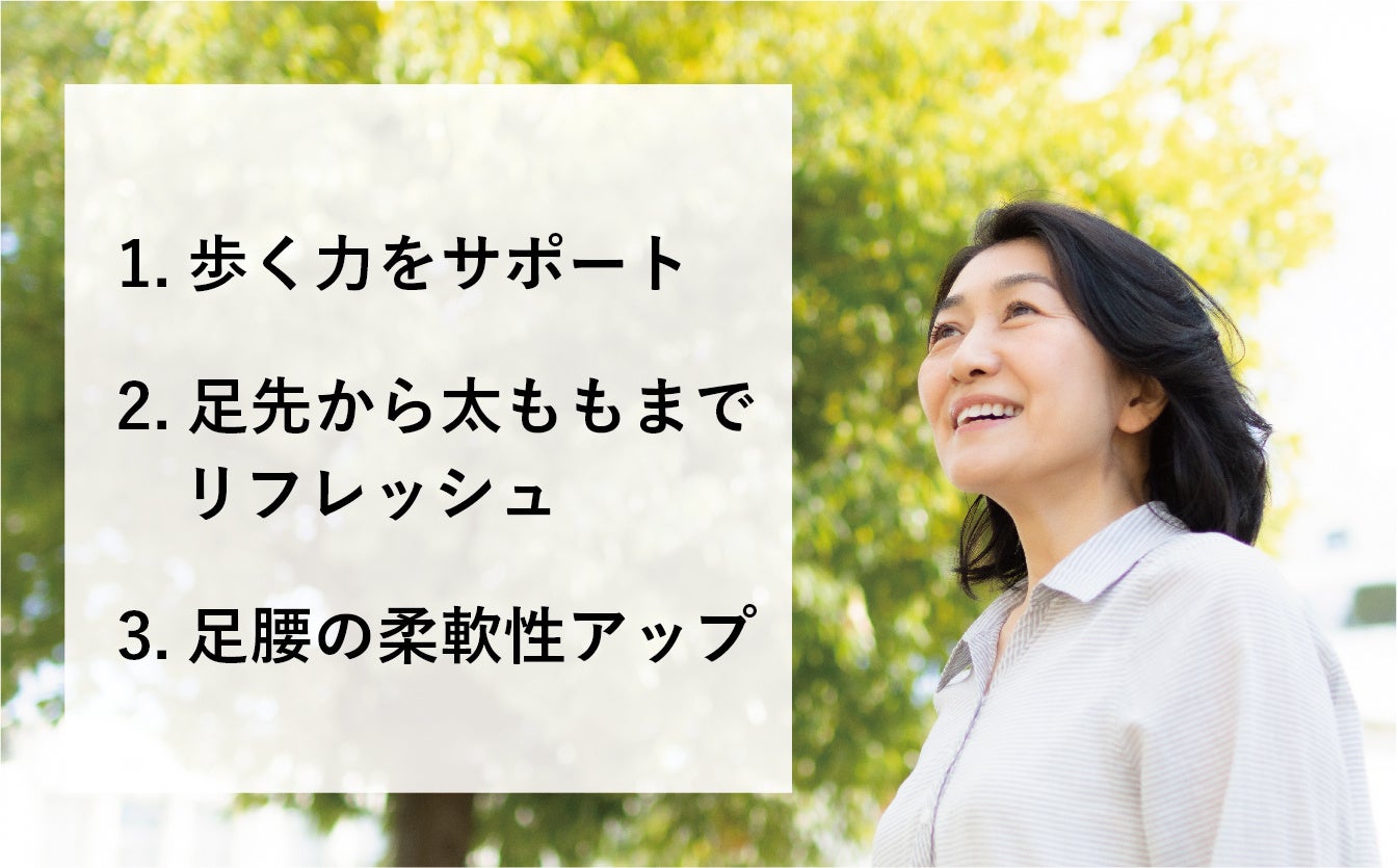 これまでマッサージクッションをはじめとする健康器を数多く開発・発売してきました。ウエルネスカンパニーとして、日々変化するライフスタイルにより沿ったものは何かを考え、開発したものが当製品です。加齢と共に消極的になる歩行を少しでも快適に、と生まれた当製品は使い続けることで「歩く力」をサポートすることができます。より長い時間を健康に過ごすために続ける健康機器です。