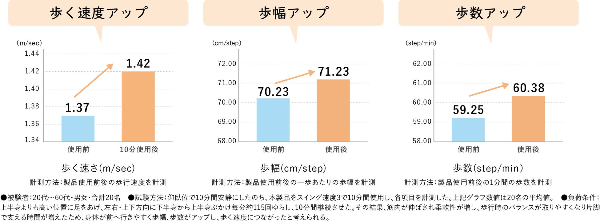 速度・歩幅・歩数がアップ。ゆらゆら運動が歩行をサポートします。
