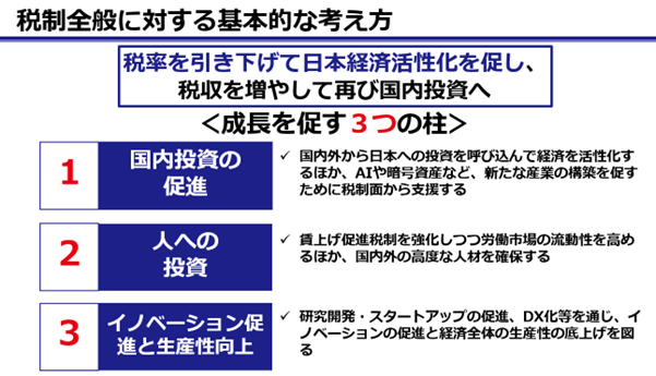 国内外から日本への投資を呼び込んで経済を活性化するほか、AIや暗号資産など、新たな産業の構築を促すために税制面から支援する