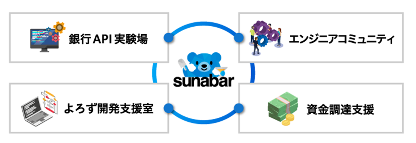 銀行API導入障壁を下げる取り組みの一環として、2020年に、国内銀行初※の常時開放したAPI開発のテスト環境である「sunabar」の提供を開始いたしました。「sunabar」は、「銀行API実験場」と、開発者が集う「エンジニアコミュニティ」、銀行機能や新技術提供などシステム面から新規ビジネスの機会創出を支援する「よろず開発支援室」、資金面から開発支援を行う「資金調達支援」の4つの役割をもち、お客さま企業のサービスへ付加価値を提供しています。
