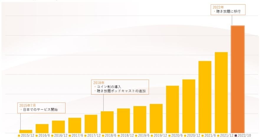 2021年12月から2022年10月で、会員数が32%増加しました。聴き放題サービスへの移行や、近年のワークスタイルやライフスタイルの変化に伴い、音声コンテンツはますます浸透しており、日常的に楽しんでいただいているユーザーの数も増えました。