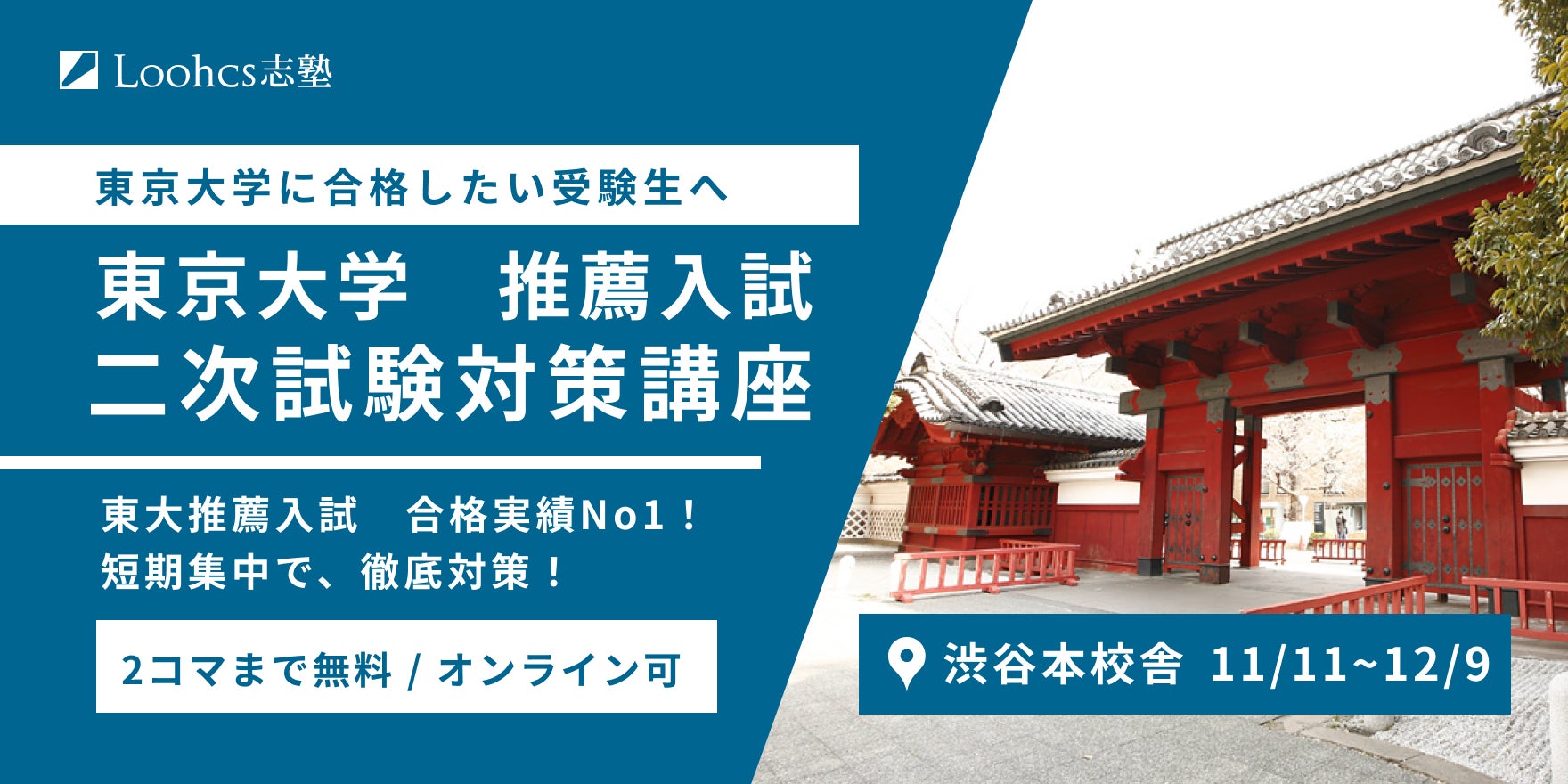 Loohcs志塾渋谷校舎では、ただいま期間限定で「東大推薦二次対策キャンペーン」を実施しております。試験直前の最後の仕上げにぜひLoohcs志塾をご活用くださいませ。