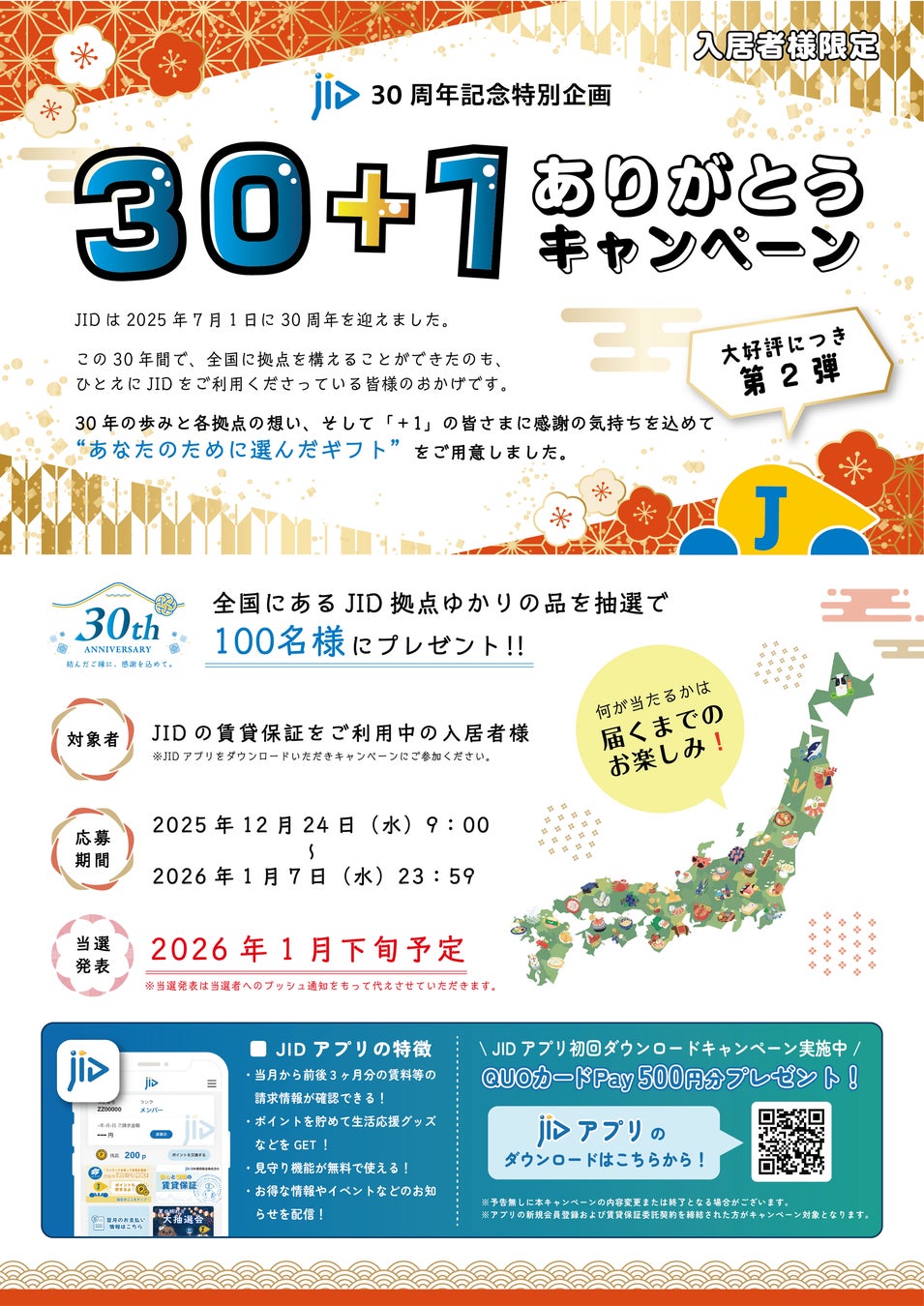 JIDをご利用の入居者様を対象に、全国の支店から感謝のギフトが当たる『30+1のありがとうキャンペーン 第2弾』開催決定!