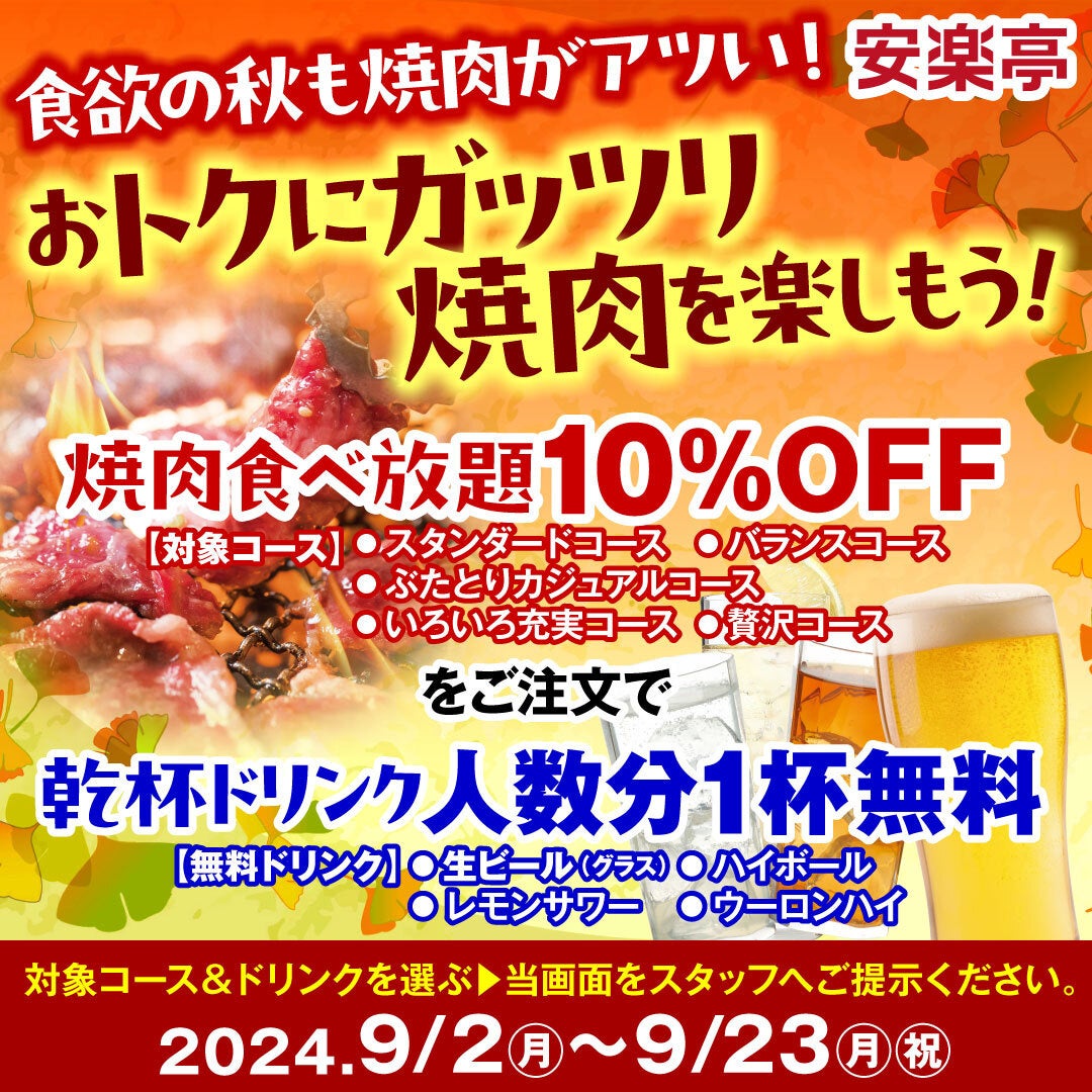 焼肉レストラン安楽亭(本社:埼玉県さいたま市、代表取締役:柳 先)は、2024年9月2日(月)~9月23日(月・祝)の期間「秋の焼肉食べ放題10%OFFキャンペーン」を実施します。