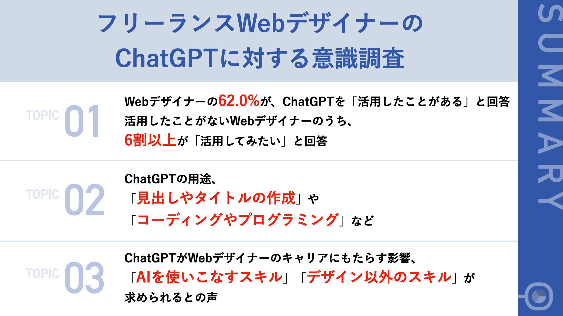 今回の調査では、フリーランスWebデザイナーが業務効率化を図る上で、ChatGPTを積極的に活用している、あるいは、今後活用していこうという意向であることが判明しました。しかし、AI技術を脅威として捉えているWebデザイナーは少なくなく、「まずはAIを使いこなすことができるようになること」、そして、「デザイン以外のスキルも身につけること」で、Webデザイナーとしてのキャリアを盤石なものにしようと考えている実態が明らかとなりました。