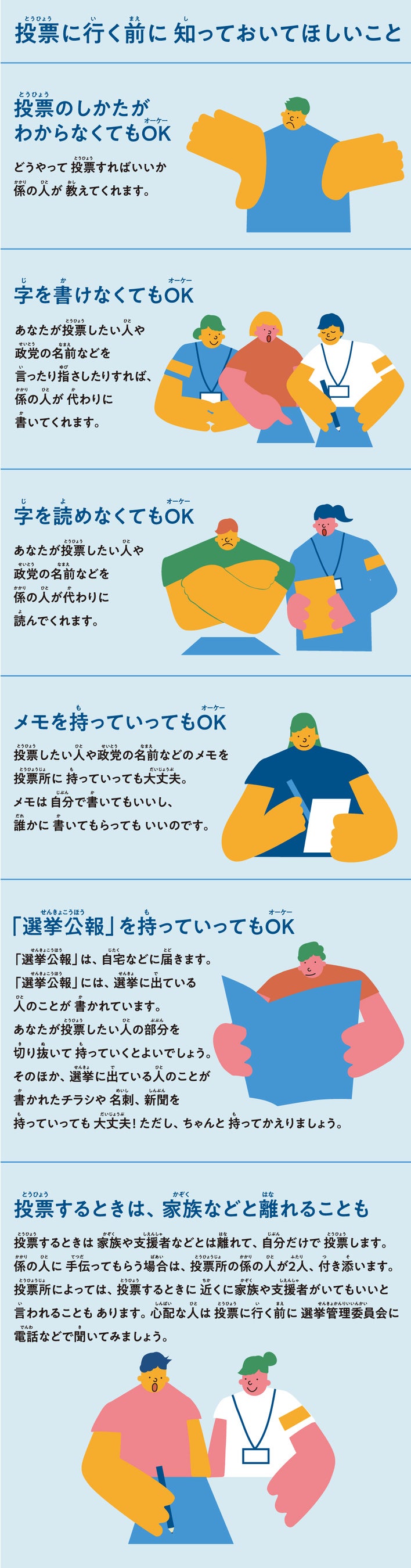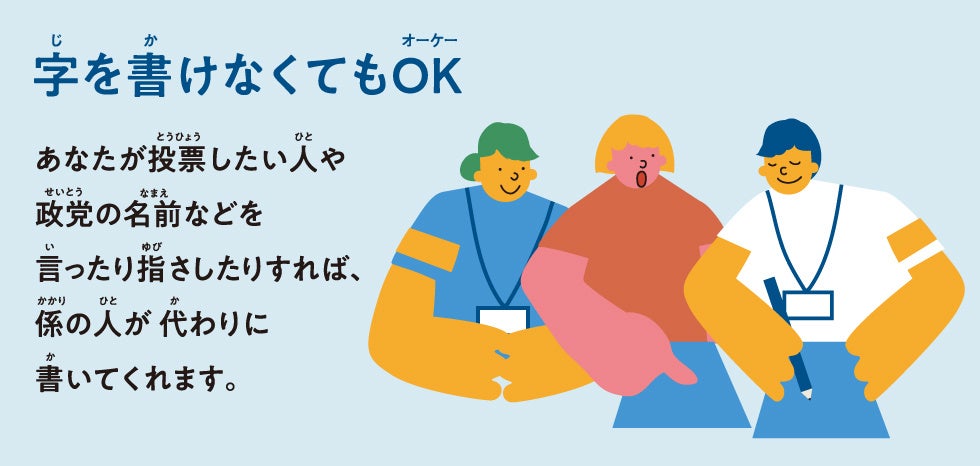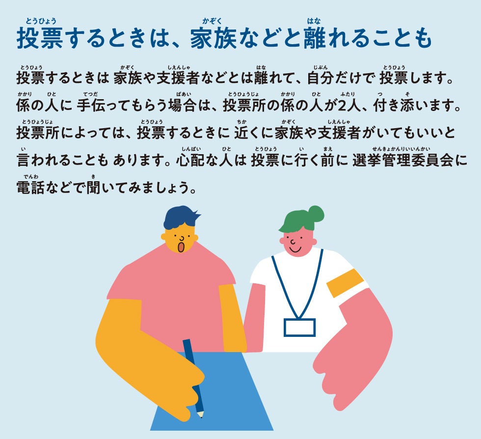 - どうせわからないだろうと決めつける前に、わかりにくいものを変えましょう。それが社会の責任です。多様性を大事にする社会における礼儀です。政治に切実な関心を持った知的障害のある人は大勢います。自らの生活を支える福祉をよりよいものにし、差別や虐待をなくし、誰もが参加できる社会をつくるためには、政治の力が必要なのです。そのためのかけがえのない1票です。誰にとってもわかりやすい選挙、投票しやすい情報やサポートを今こそ、実現しましょう。