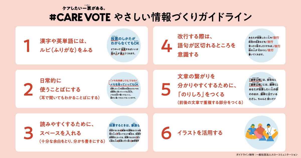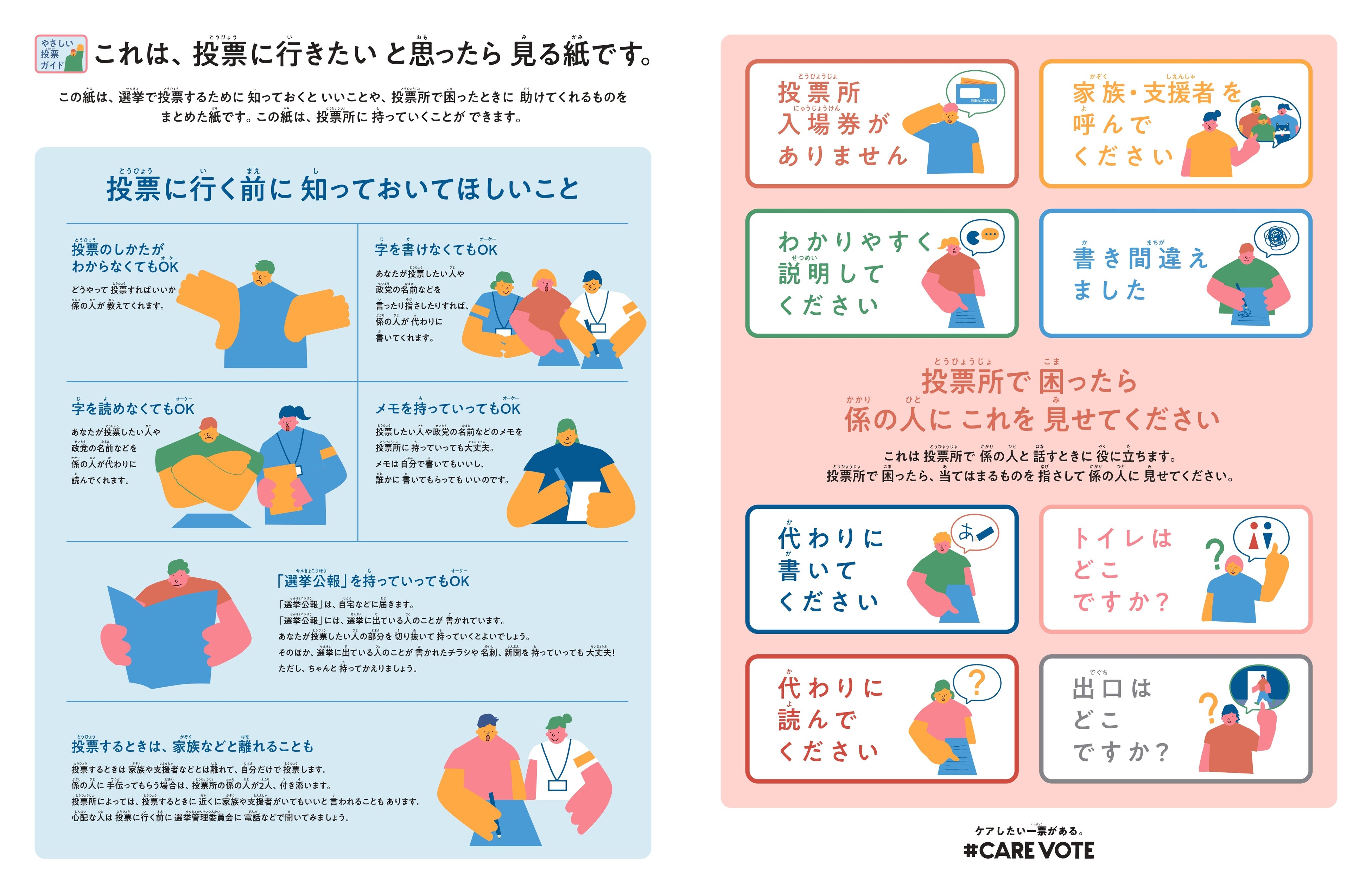 今回、2022年7月の参議院選挙にあわせ、選挙や投票における社会側の障害について考え、議論するきっかけになることを期待し、「#CAREVOTE」の提唱と「やさしい投票ガイド」の作成・公開を決定いたしました。