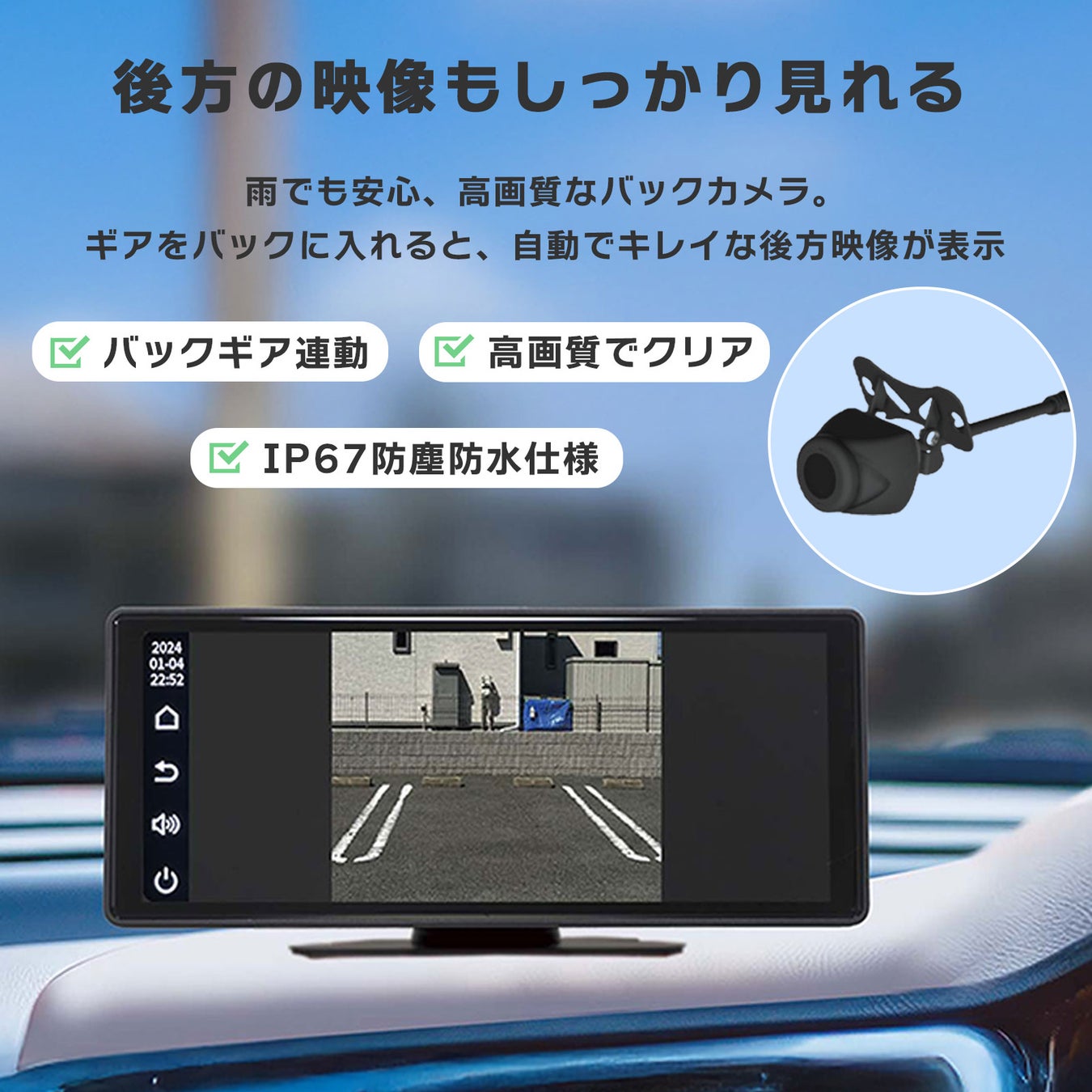 IP67防塵防水しよう野い亜カメラで高画質でクリアな映像を表示します。バックギア連動なので、バックをすると鮮明に後方下部の映像が表示されます。