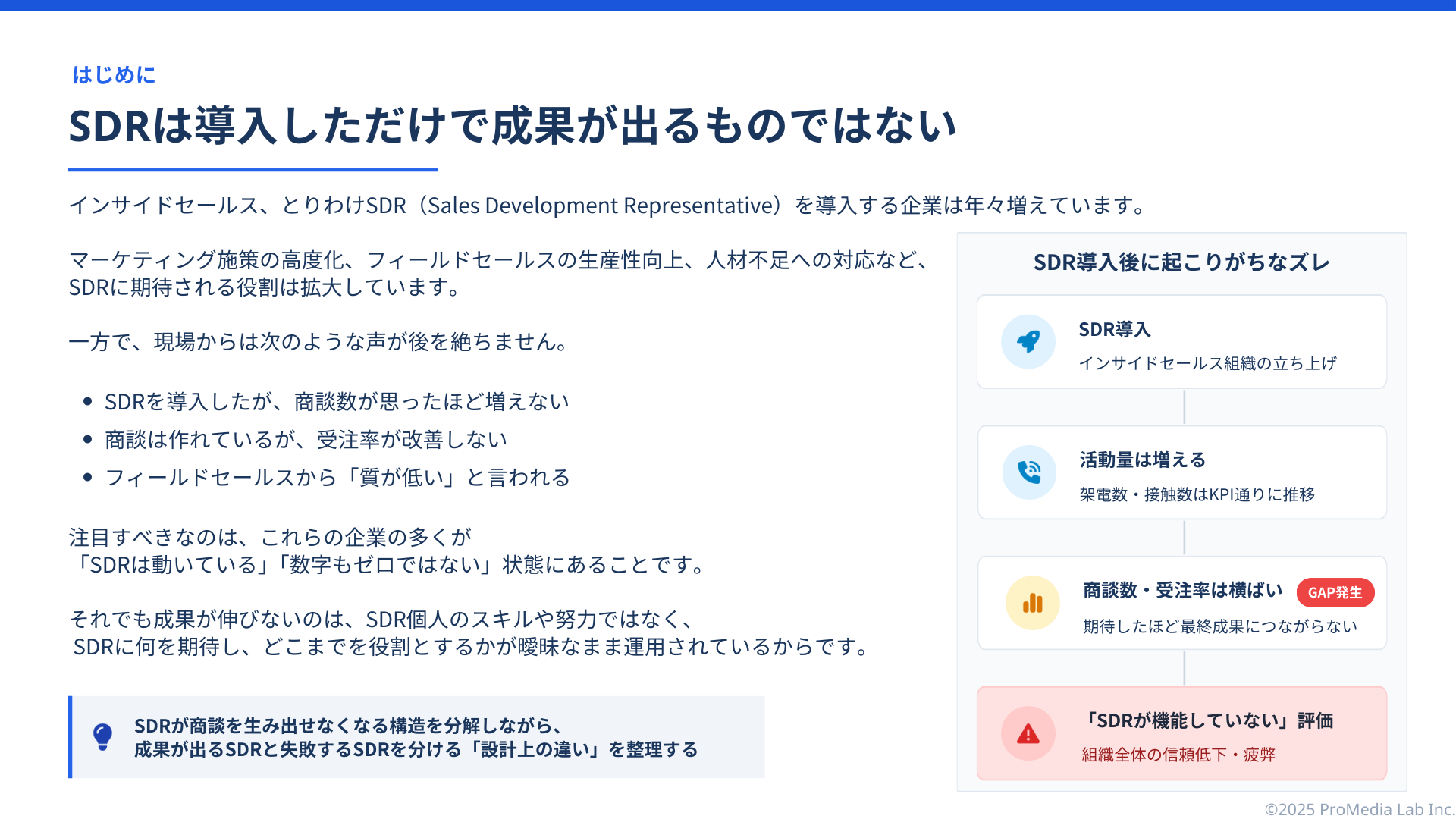 成果が出るSDRと失敗するSDRを分ける「設計上の違い」を明らかにしています。