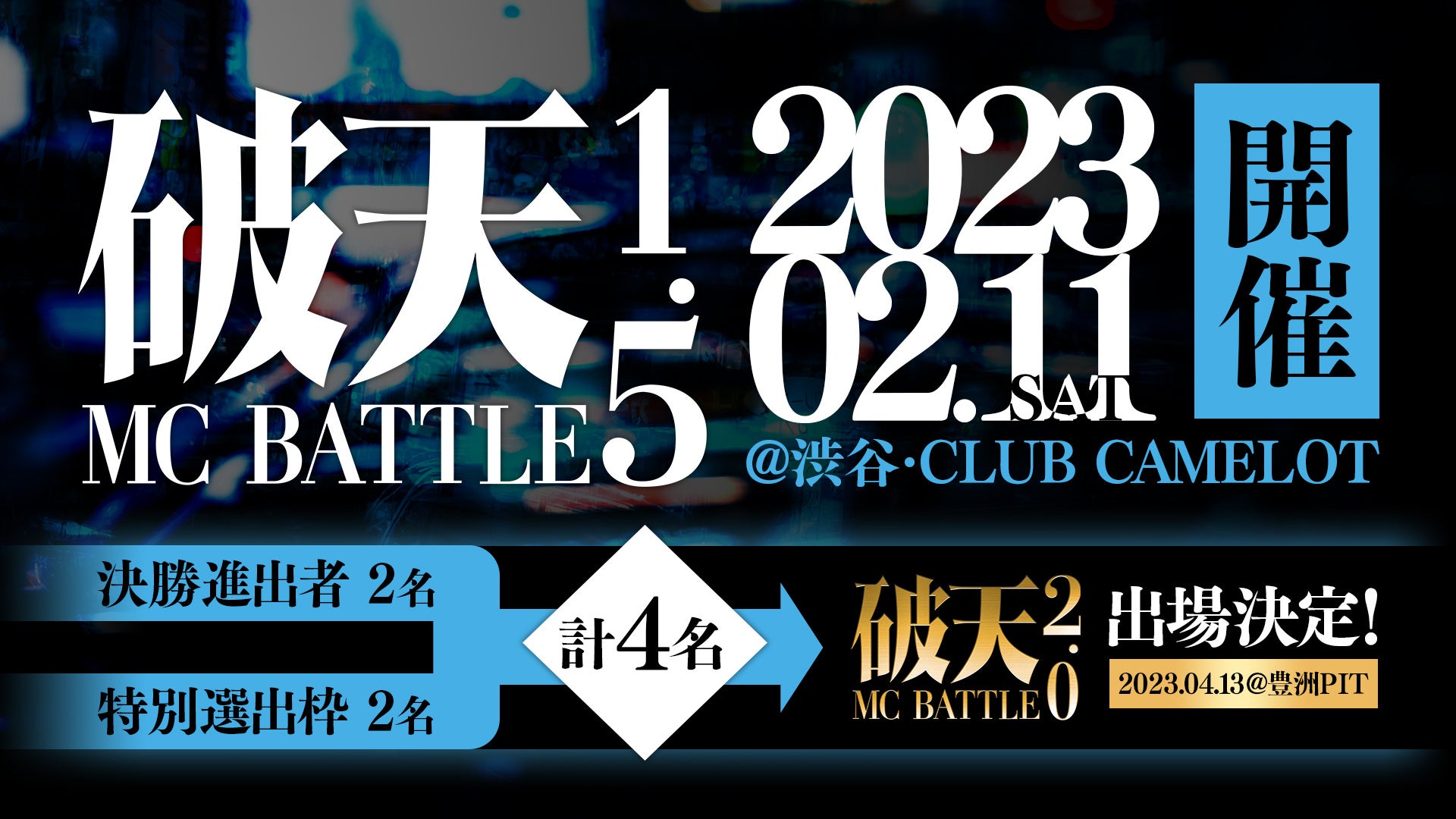 『破天MCBATTLE 1.5』に出場する32名のMCのうち、決勝進出者2名と破天公式YouTubeチャンネル(https://www.youtube.com/@hatenmicrophone )にて公開された動画の再生数やコメントを加味して選ばれた、特別選出枠2名の計4名が、2023年4月13日(木)に豊洲PIT(東京都江東区)にて実施する『破天MCBATTLE 2.0』に出場する権利を獲得いたします。
