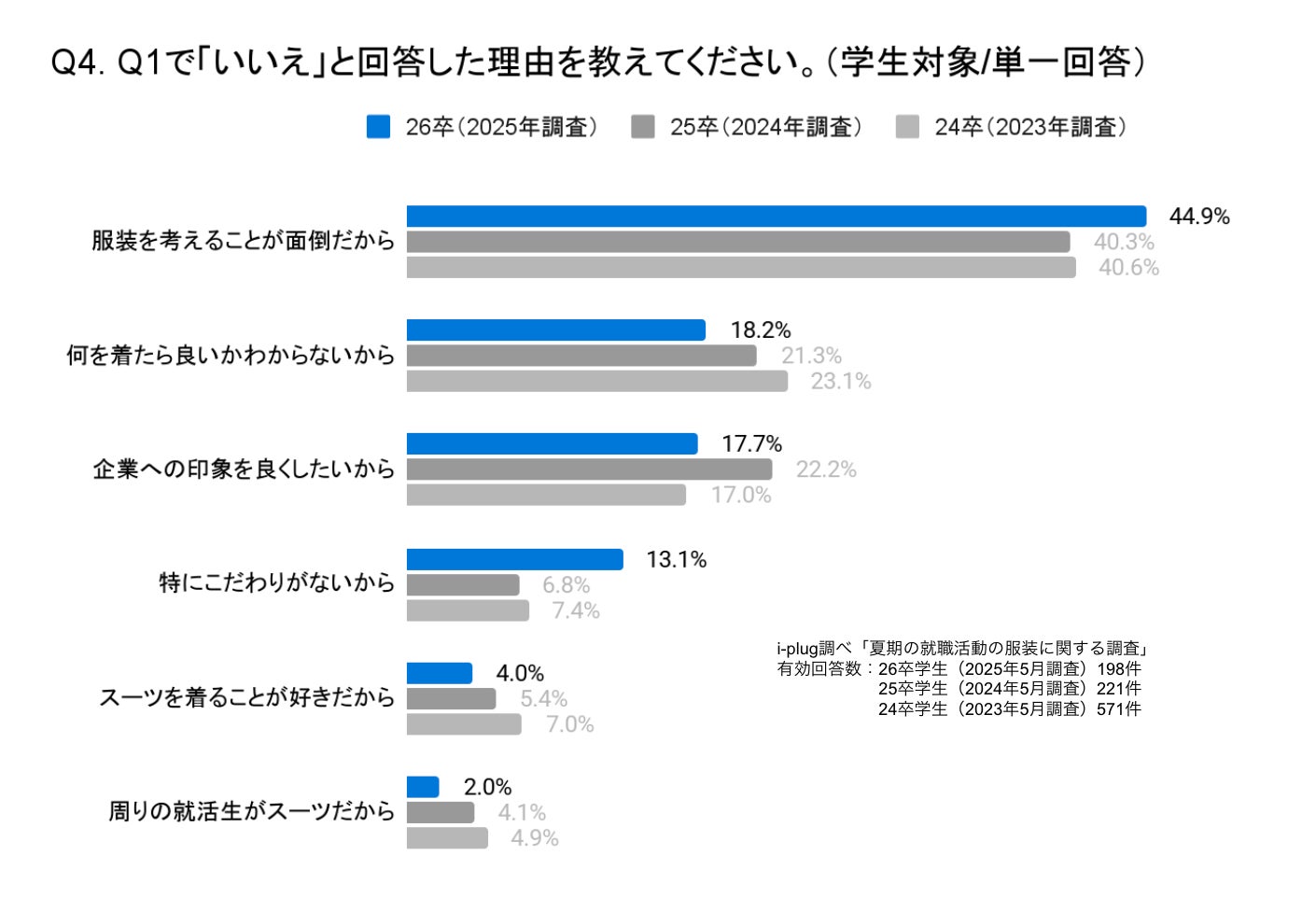 「夏期の就活において、リクルートスーツで就活をしたい」理由として、「服装を考えることが面倒だから」が最多の44.9%。昨年度の同様の調査内容と比較すると、4.6ポイント増加しました。次いで「何を着たら良いかわからないから」が18.2%。6割以上の学生が、最適な服装がわからないため、リクルートスーツを希望していると推察されます。