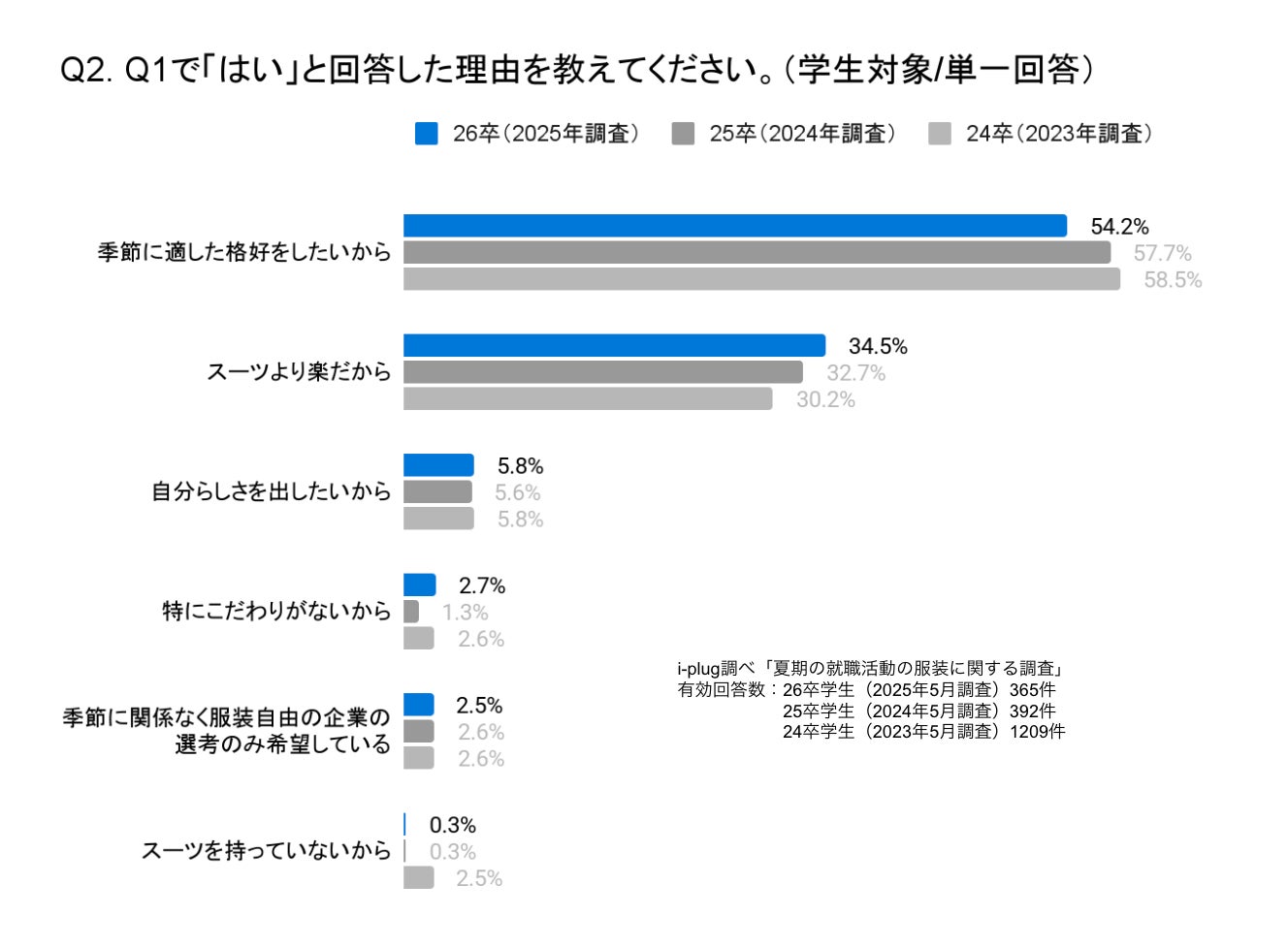 リクルートスーツ以外で就活をしたい理由として、「季節に適した格好をしたいから」が最多の54.2%でした。次いで「スーツより楽だから」が34.5%。