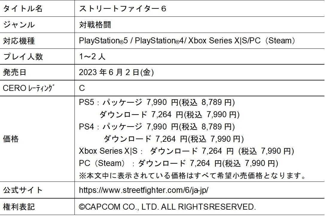 2022 年 2 月に『ストリートファイター6』の制作発表が行われて以降、同年8月に開催されたEVO 2022(アメリカ・ラスベガス)で新キャラクター「キンバリー」を発表、9月に開催された東京ゲームショウ2022では新モードや新機能情報を公開、10 月にはクローズド βテスト(CBT)が開催されるなど、次々と発信される情報が全世界のゲームプレイヤーを熱くさせています。正統進化と革新を併せ持つ新たな『ストリートファイター6』は、家庭用とアーケード版で世界中のプレイヤーを魅了します。その他詳細については、公式ページにて順次発表してまいります。