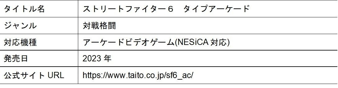 株式会社タイトー(本社:東京都新宿区、代表取締役社長:岩木克彦、以下タイトー)及び、株式会社カプコン(大阪市中央区、代表取締役社長:辻本春弘、以下カプコン)は、人気対戦格闘ゲーム「ストリートファイター」シリーズ最新作『ストリートファイター6』のアーケード版開発を決定いたしましたことをお知らせいたします。