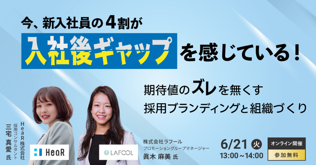 「個人が変われば、 組織が変わる」組織改善サーベイ『ラフールサーベイ』を提供するメンタルデータテック®︎の株式会社ラフール(本社:東京都中央区、代表取締役社⻑:結木啓太、代表取締役副社長:小梨明人、以下「ラフール」)は、HeaR株式会社(本社:東京都品川区、代表取締役CEO:大上 諒、以下「HeaR」)と『今、新入社員の4割が入社後ギャップを感じている!期待値のズレを無くす採用ブランディングと組織づくり』をテーマとした共催セミナーを2022年6月21日(火) に開催します。
