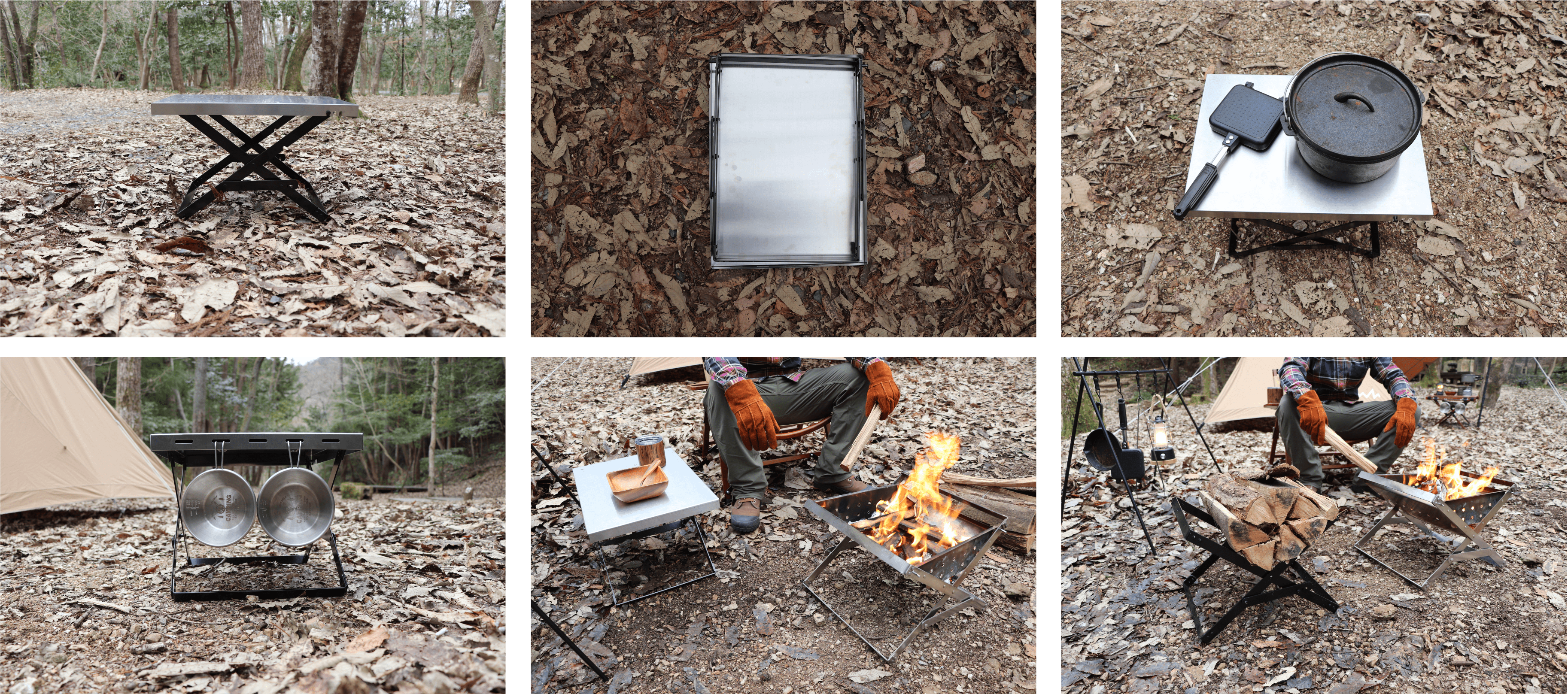 天板着脱式で使い勝手にこだわった焚き火テーブル「ファイヤーサイドテーブル」は、天板を使っての焚き火テーブルとしての使用はもちろん、天板を外して薪置台としてもご利用いただけます。また、天板の材質には耐熱性に優れたステンレスを使用しているため、コップやお皿等の小物はもちろん、熱した鍋やダッチオーブン等を直接置くことも可能です。側面には穴が空いており、シェラカップやツールを引っ掛けられることから、机の上をスッキリと保つことができます。