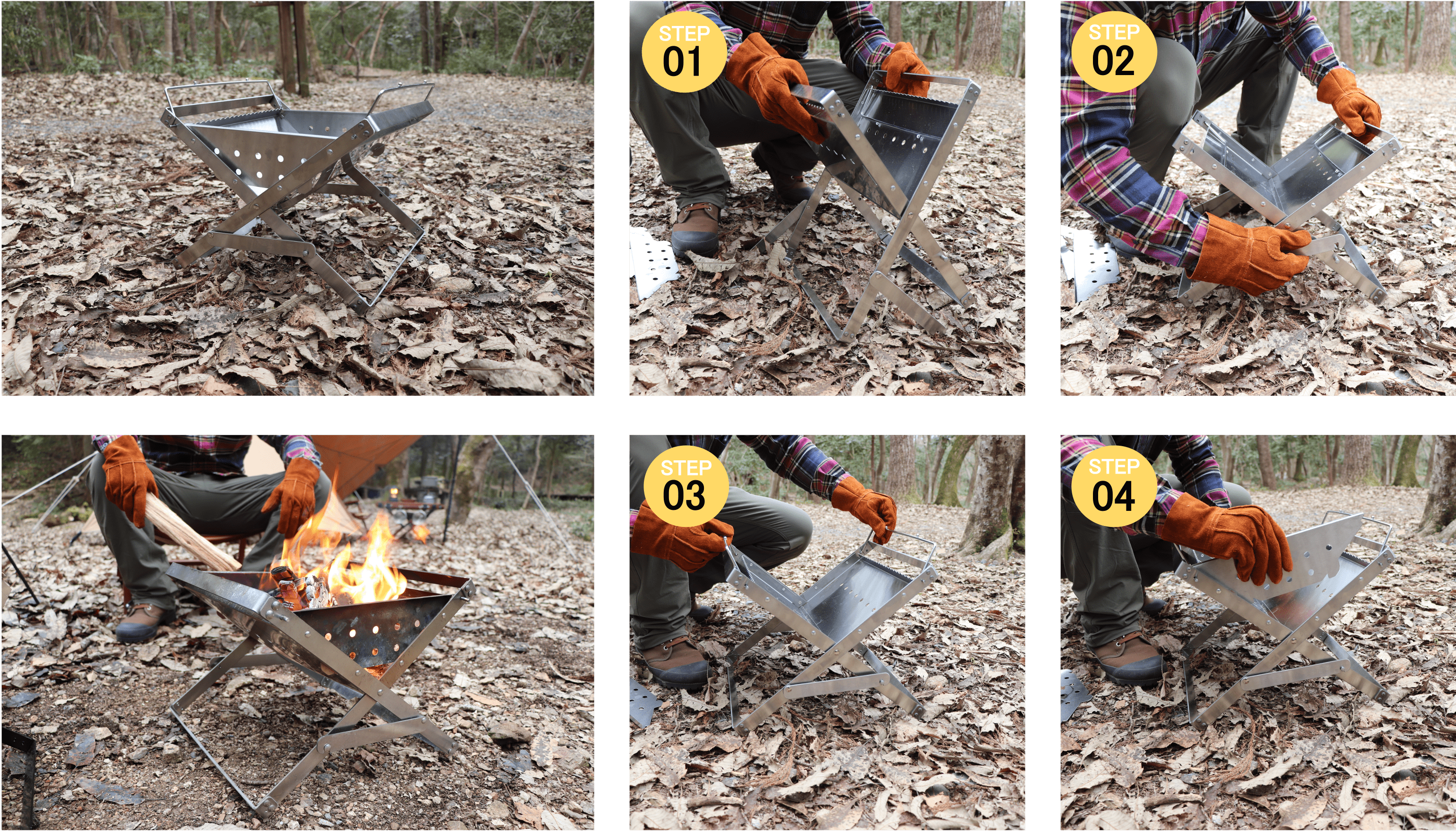「フォールディングファイヤーピット」は、開いて置くだけで簡単に設営できるシンプル設計を採用しているため、お子様とご一緒でも簡単に組み立てることができます。また、耐久性、耐熱性に優れたステンレス素材を使用し、プレートに曲げ加工を施すことで、焚き火の熱によるプレートの変形を軽減します。さらに、焚き火を活用して調理をする際には、網フレームを開閉することで高さ調節ができることから、火加減をコントロールすることが可能です。また、サイドプレートは着脱式を採用しており、薪入れが簡単かつ灰が地面に落ちにくいため、自然に配慮しながら焚き火をお楽しみいただけます。
