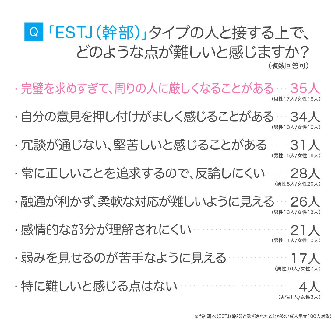 「ESTJ(幹部)と診断されたことがない成人男女100人」を対象に、ESTJ(幹部)の難しいと感じる点についても尋ねてみました。