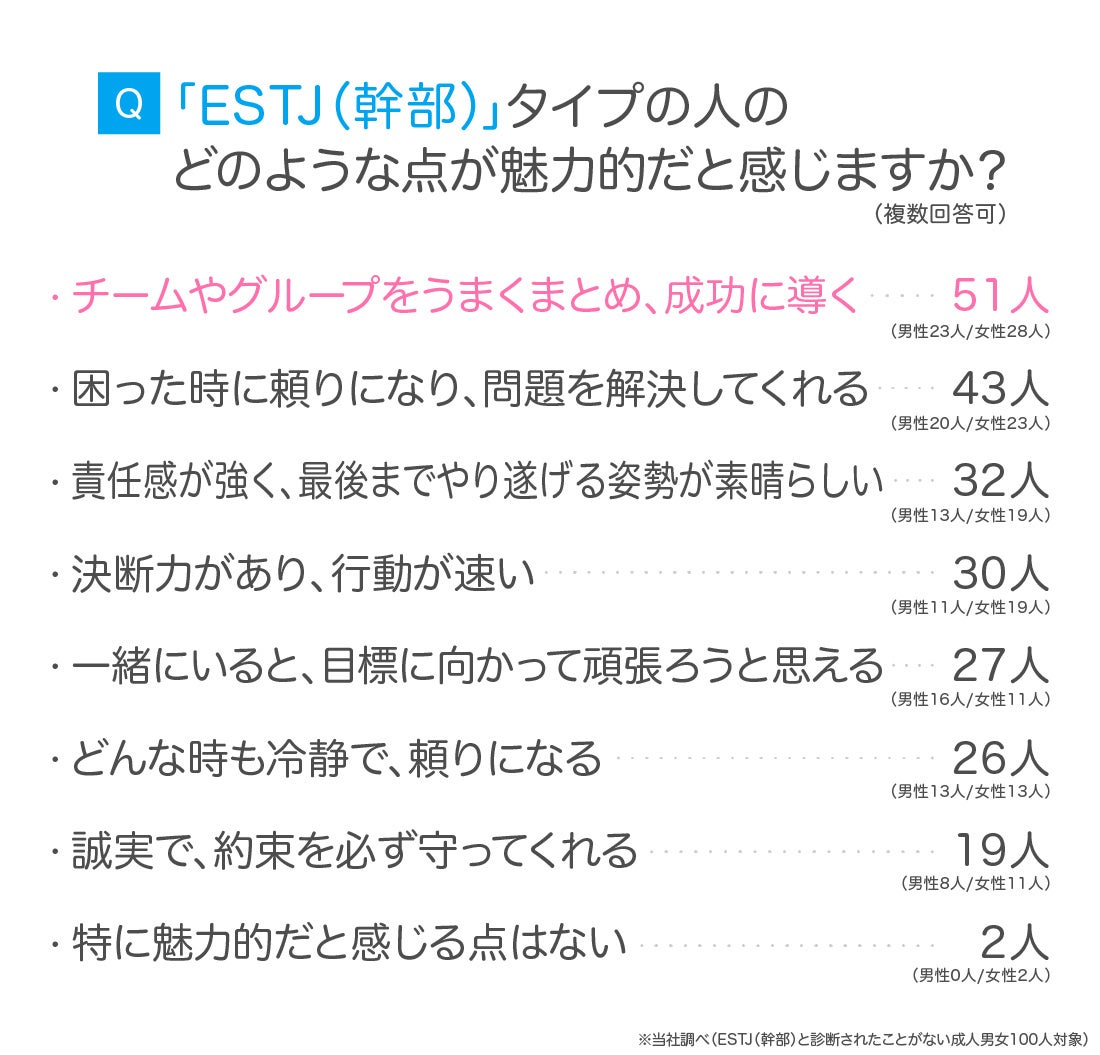続いて、「ESTJ(幹部)と診断されたことがない成人男女100人」を対象に、ESTJ(幹部)のどのような点が魅力的だと感じるかについて、アンケート調査を実施しました。