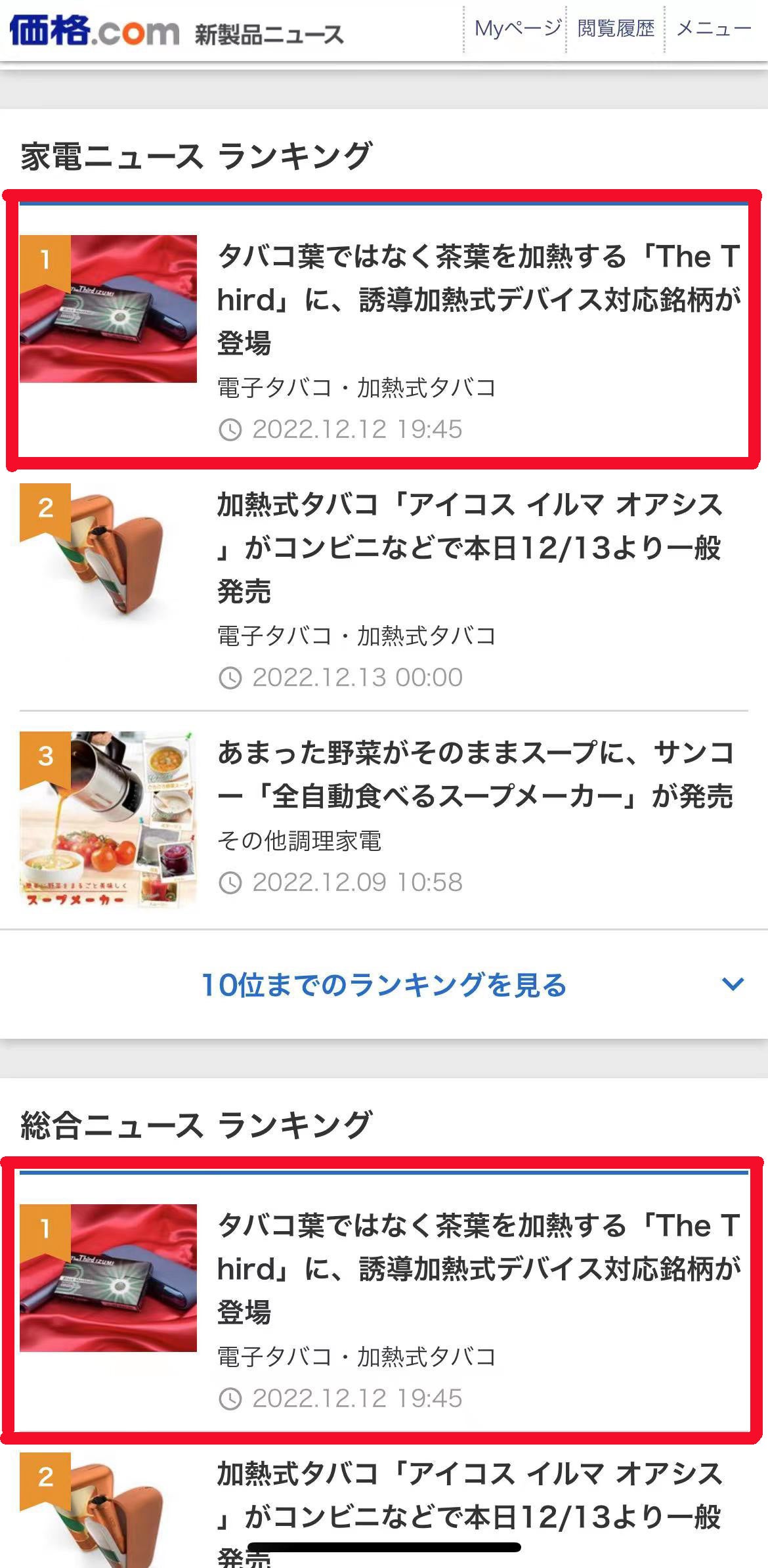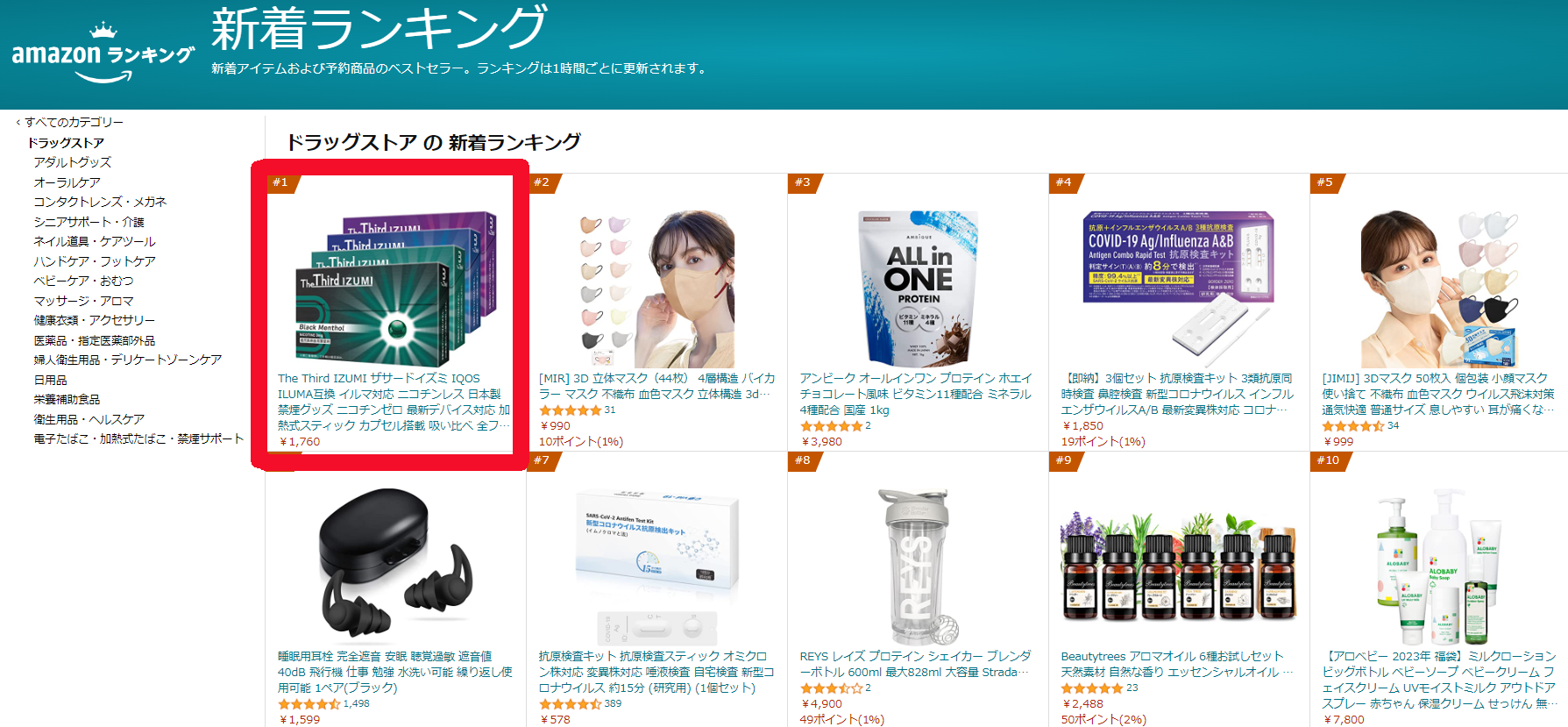 ノンニコチンスティックThe Third IZUMIがAmazonランキング〈ドラッグストアカテゴリ〉にて、「新着」と「売れ筋」の両ランキングで1位を獲得しました(2022年12月22日時点)。また価格比較サイト「価格.com」においても、「総合ニュース」と「家電ニュース」の両ランキングで1位を獲得(2022年12月12日時点)。