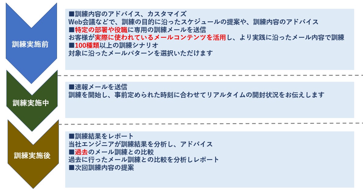 100種類以上のフォーマットからフルカスタマイズが可能となっており、コンサルタントからの訓練フォローも含んでおります。1~300通:158,000円、~1000通:198,000円、1001通以上:298,000円~と、従来のメール訓練サービスに比べて内容の充実を図るとともに低価格を実現したサービスとなっております。