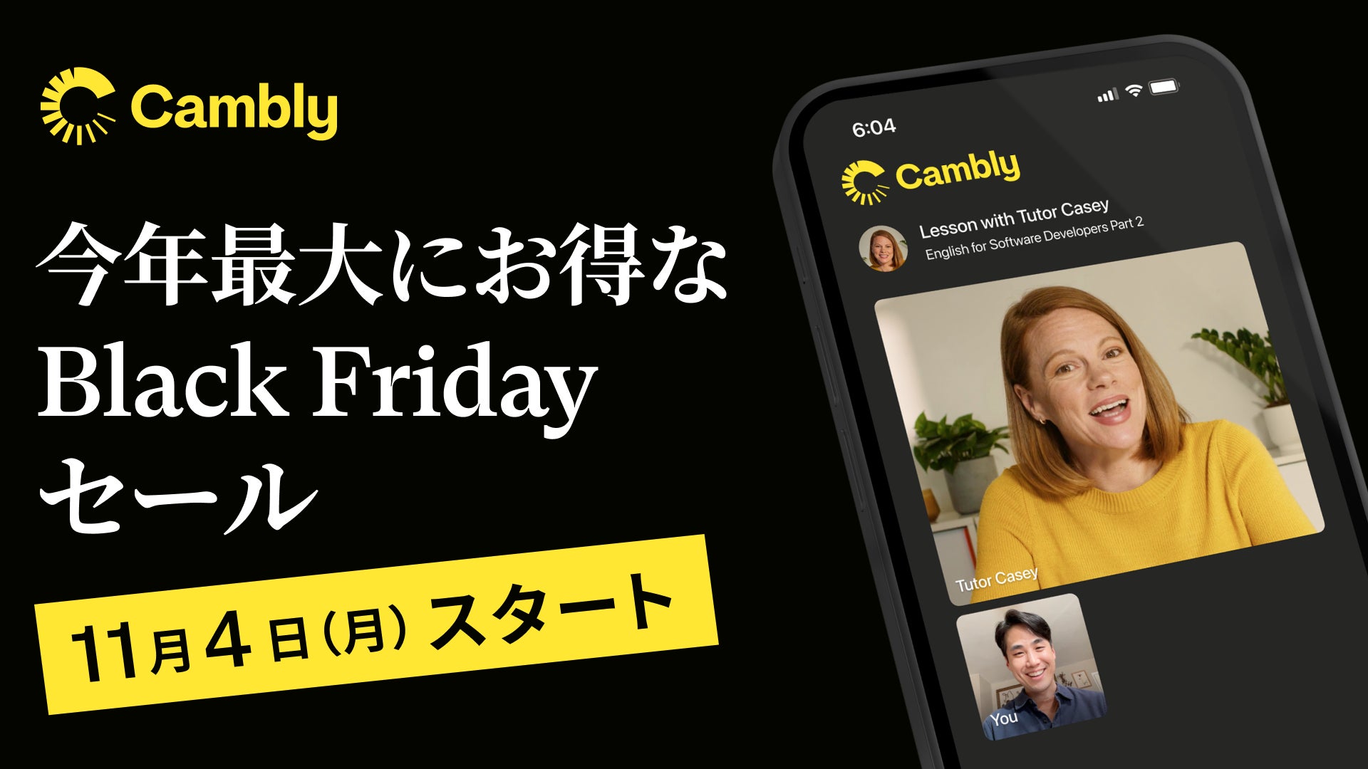 このチャンスをお見逃しなく!BLACK FRIDAYまでに、Camblyに登録、無料のレベルチェックを受けて、スピーキング力のスコアとおすすめのレッスンプランの提案を受け取りましょう。