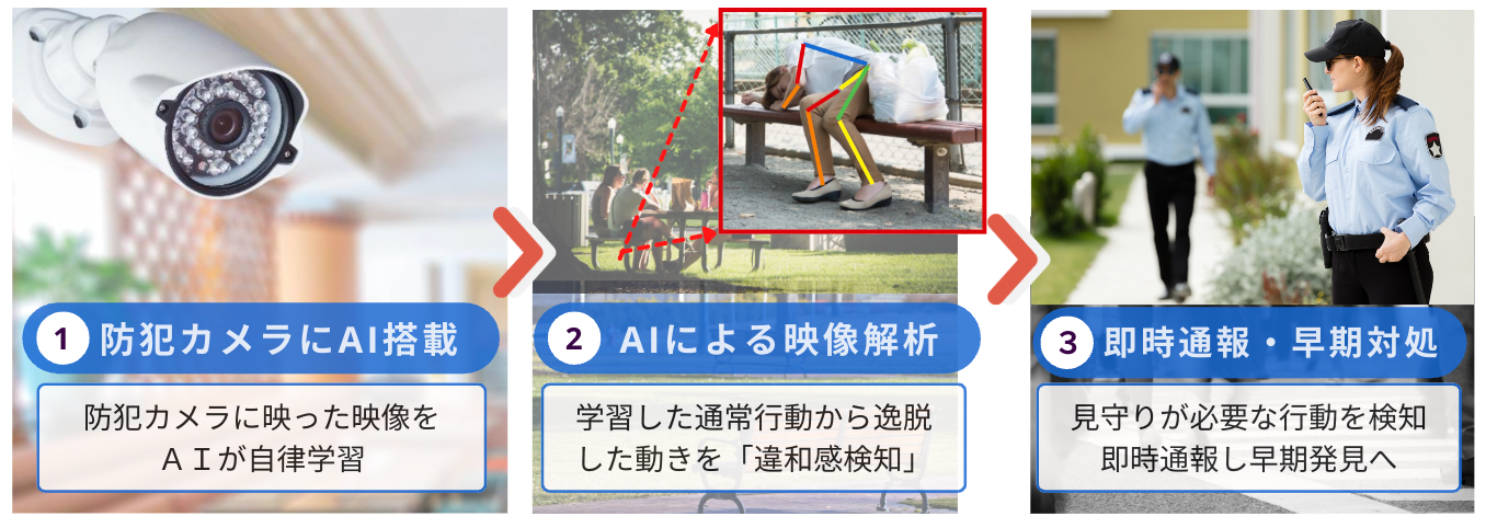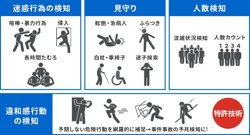 各カメラにおける行動をAIが自律学習し、通常から逸脱した動きを「違和感」として検知。予期しない危険行動を即時通知することで、事件事故の未然防止に繋げます。