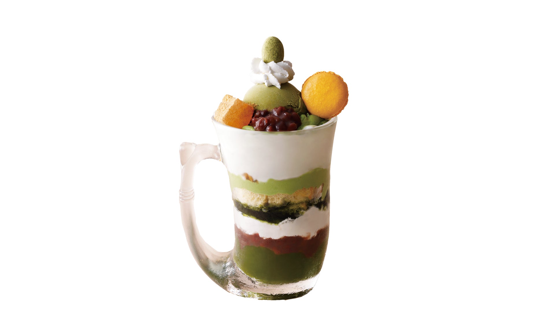 たっぷりサイズの「ジョッキパフェ(抹茶)」では、「抹茶パフェ」のトッピングに加え、抹茶アイスやバニラアイス、抹茶ティラミスチョコ、シフォンケーキなどを大きなジョッキに詰め合わせた満足感のある一品です。家族や友人とシェアをしながら愉しむこともできます。
