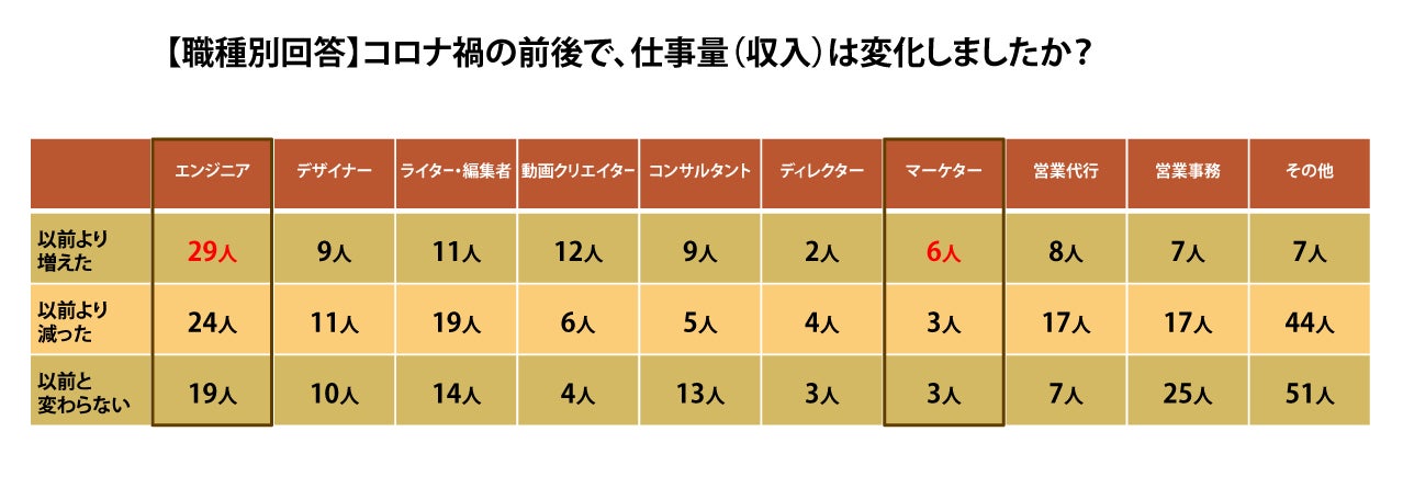 コロナ禍におけるフリーランスの業務受注の厳しさが垣間見える一方で、回答職種別に見てみると「エンジニア」と「マーケター」に関しては「以前より増えた」という回答が最多であることがわかります。コロナ禍の影響は、職種によって格差が見られるようです。