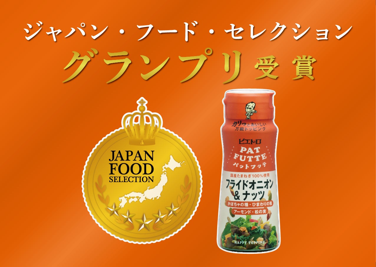 株式会社ピエトロ(本社:福岡市中央区、代表取締役社長 高橋 泰行) が製造・販売する万能トッピング「ピエトロ PATFUTTE フライドオニオン&ナッツ」が、一般社団法人フードアナリスト協会主催の「第74回ジャパン・フード・セレクション」において、初エントリーで、最高位の『グランプリ』を受賞しました。
