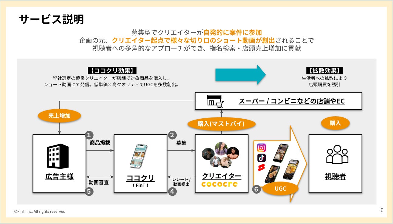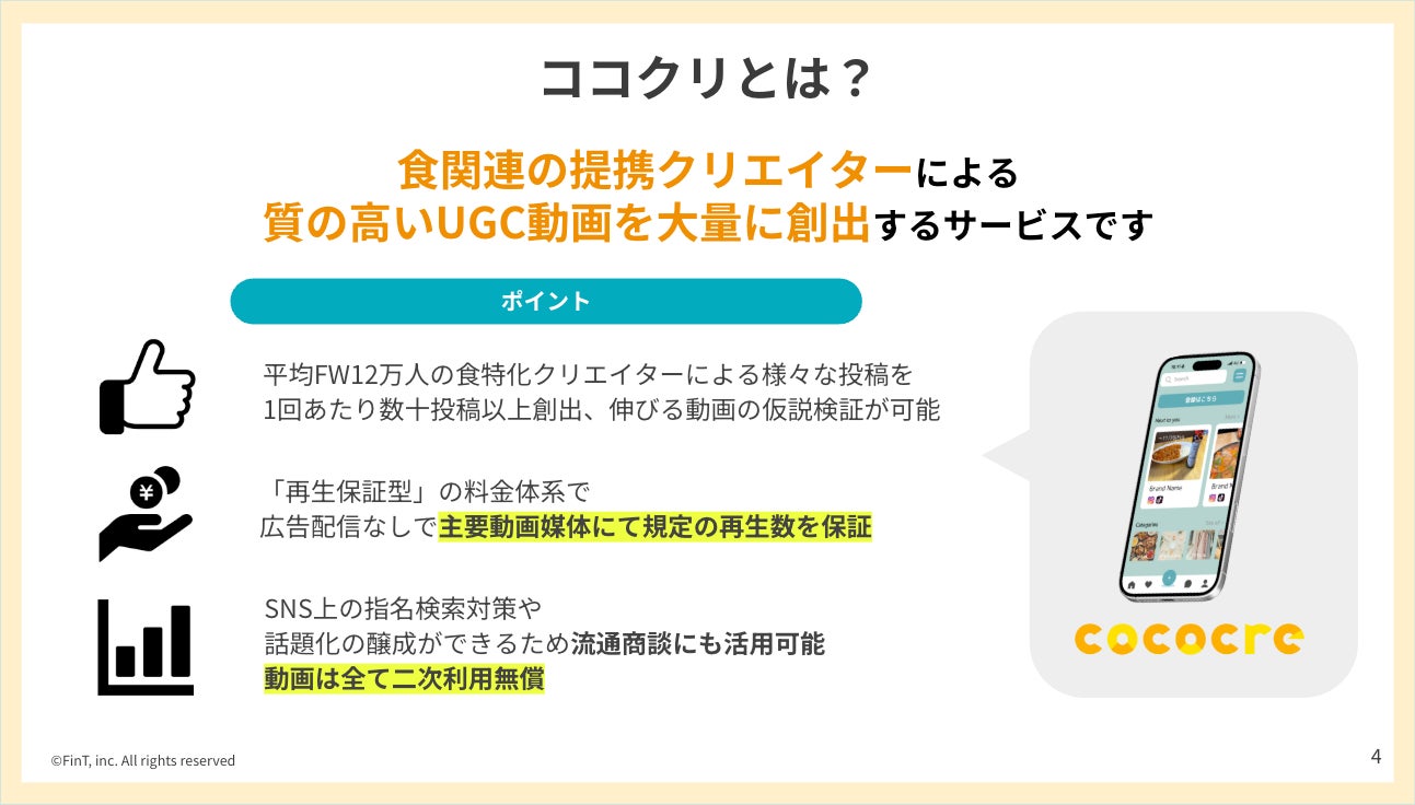 株式会社FinT(本社:東京都渋谷区、代表取締役:大槻祐依)が運営するクリエイターマッチングサービス『ココクリ』は、ショート動画に強みを持つ口コミ創出サービスです。食品飲料に関心のある600名のクリエイターが所属しており、SNSでの良質な口コミを創出し、企業の商品プロモーションを効果的に支援します。
