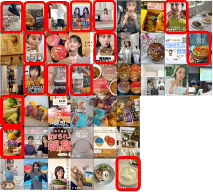 今回、ベースフード株式会社の「BASE BREAD」および「BASE YAKISOBA」のプロモーションとして『ココクリ』を活用し、多数のミドルクリエイターがSNSにPR動画を投稿しました。結果として、76件のUGCを創出し、2,253,778回の合計再生数を達成。投稿件数1.7万件のビッグタグにおいても上位50件中15件(30%)の上位表示率を獲得し、従来のフォロワー単価型タイアップと比べて、ココクリでは1施策あたりの費用を約60%以下に抑えることができました。