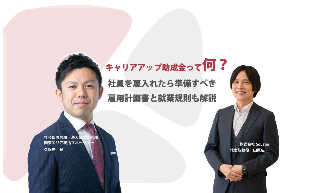 株式会社SoLabo(本社:東京都千代田区、代表取締役:田原広一、以下、SoLabo)は、社会保険労務士法人あつた労務(本社:愛知県名古屋市、代表:尾﨑良忠、以下、あつた労務)と共同で、キャリアアップ助成金の申請に必要な雇用契約書および就業規則をテーマとした無料セミナーを開催いたします。