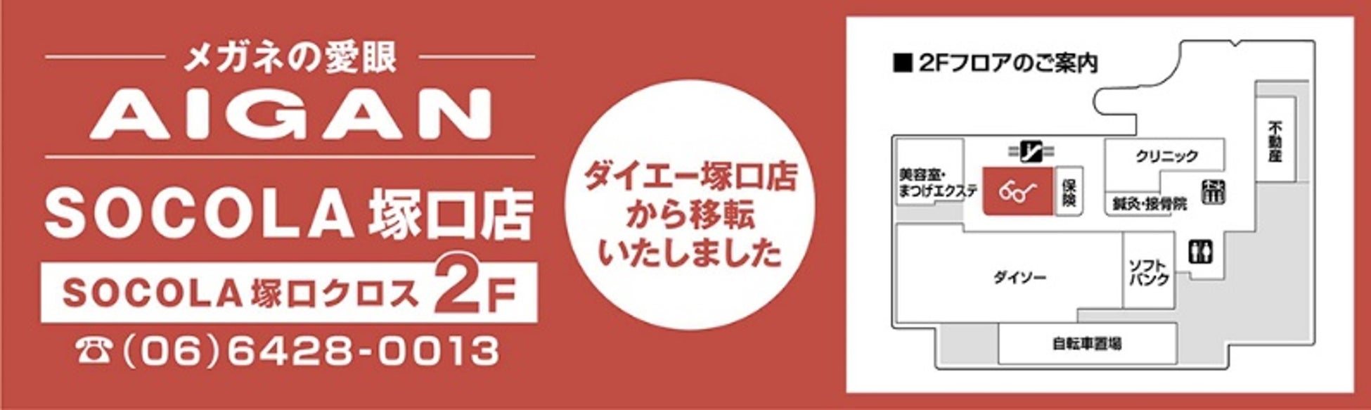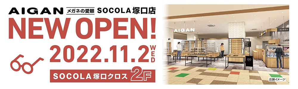 メガネ・補聴器を販売する「メガネの愛眼」「Aigan」 ( https://www.aigan.co.jp/ )を運営する愛眼株式会社(本社:大阪市天王寺区、代表取締役社長:下條 三千夫)は、2022年11月2日(水)、兵庫県尼崎市南塚口町のSOCOLA塚口クロス2Fに出店する「メガネの愛眼 SOCOLA塚口店」が移転改装グランドオープンしたことをお知らせいたします。