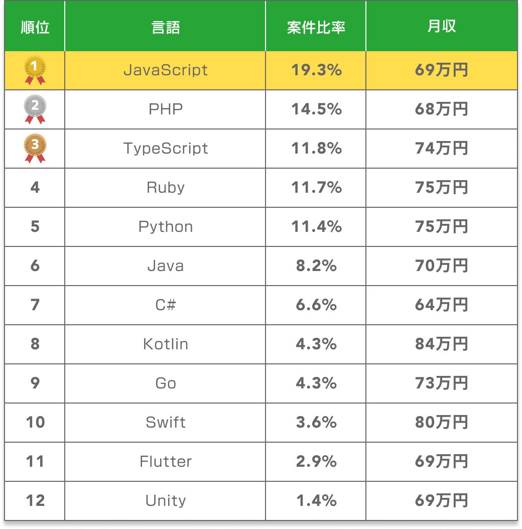 案件数では全体の19.3%を占め、プログラミング言語の中で堂々の1位となっています。この高い比率は、ほぼすべてのWebサービスでJavaScriptが使用されていることと、フロントエンドだけでなくバックエンド開発でもNode.jsの普及により需要が拡大していることが要因です。