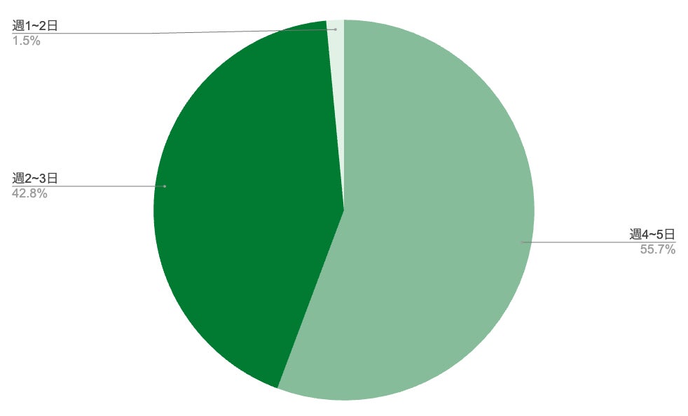 JavaScript案件の稼働日数は、週4〜5日が最も多く全体の55.7%を占めています。次いで週2〜3日の案件が42.8%となっており、フルタイムに近い案件と週の半分程度の稼働日数の案件がほぼ二分している状況です。週1〜2日の短期間稼働の案件は非常に少なく、わずか1.5%に留まっています。このデータからJavaScript開発者は比較的安定した稼働日数で働く機会が多いことがわかります。
