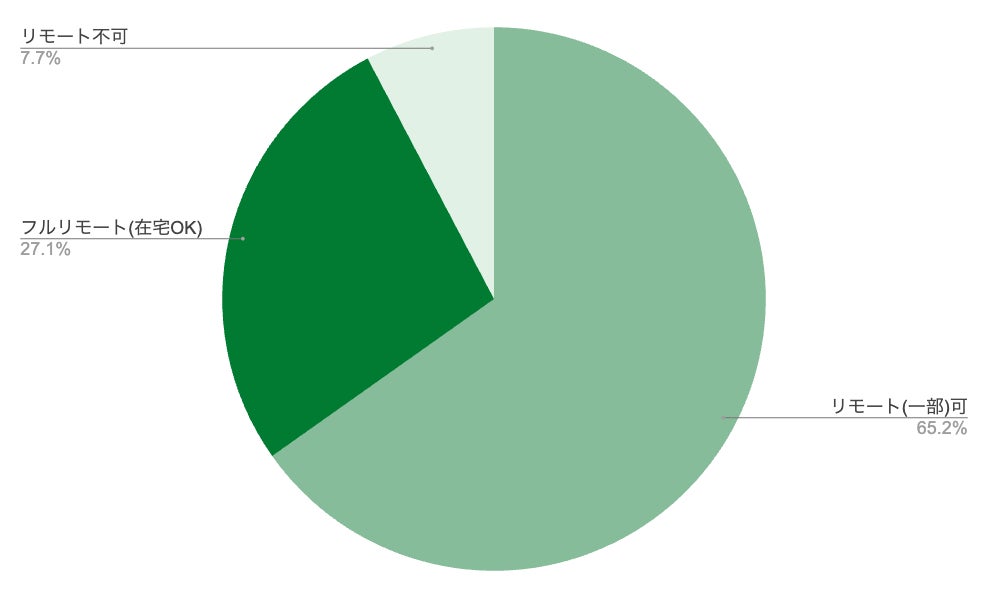 JavaScript案件はリモートワークとの親和性が非常に高く、フルリモート(在宅OK)の案件が全体の65.2%を占めています。一部リモート可能な案件も27.1%あり、合計すると92.3%の案件で何らかの形でのリモートワークが認められています。完全なオフィス勤務を求めるリモート不可の案件はわずか7.7%に過ぎません。このデータから、JavaScript開発者は働く場所の自由度が高く、柔軟な働き方を実現しやすい環境にあると言えるでしょう。