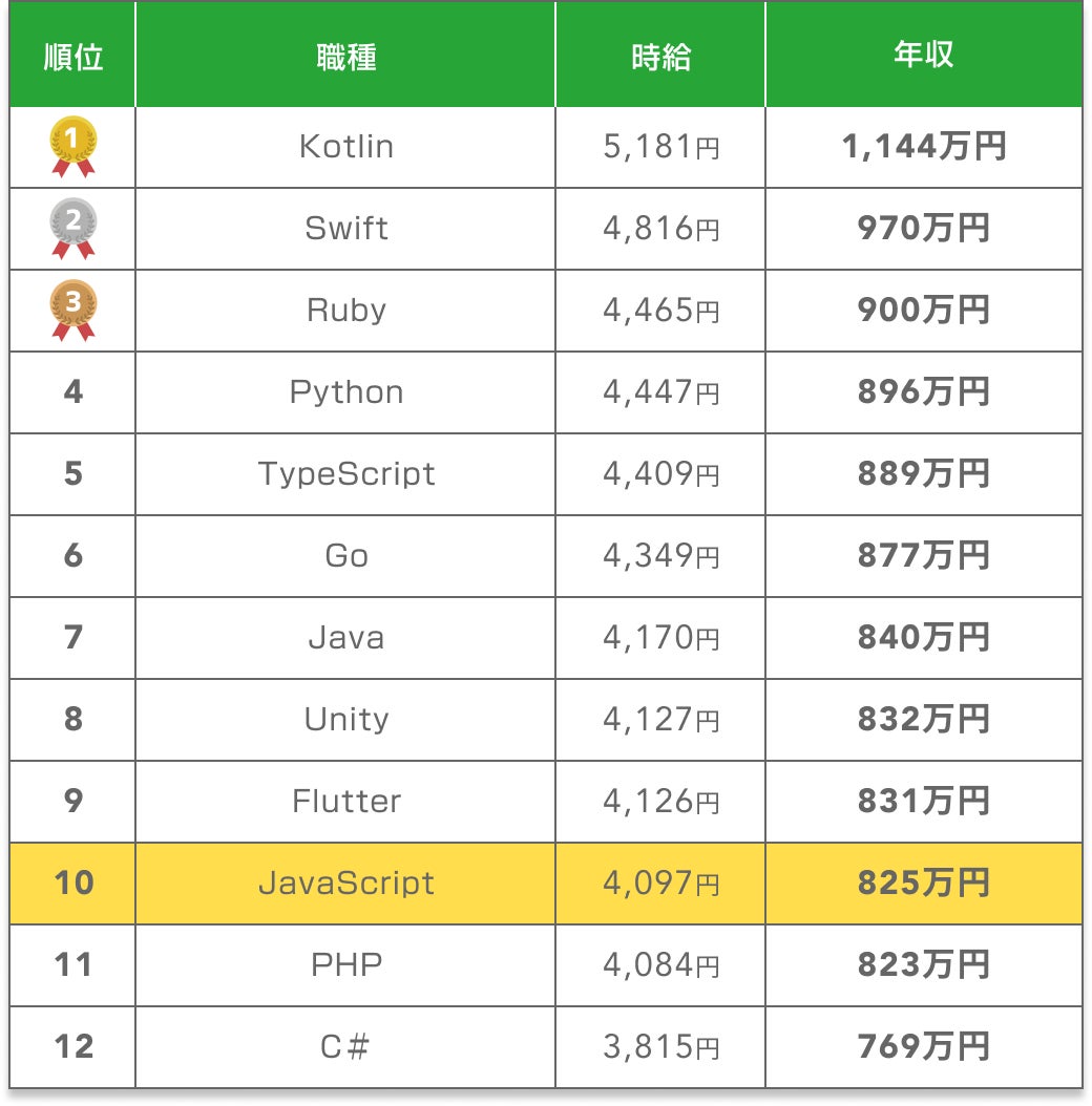 JavaScript開発者の市場価値は非常に高く、平均年収は825万円と、プログラミング言語の年収ランキングでは10位に位置しています。この数字はJavaScriptが市場で強い需要を持っていることを示しており、特にフロントエンド開発の分野では最も需要の高いスキルの一つです。