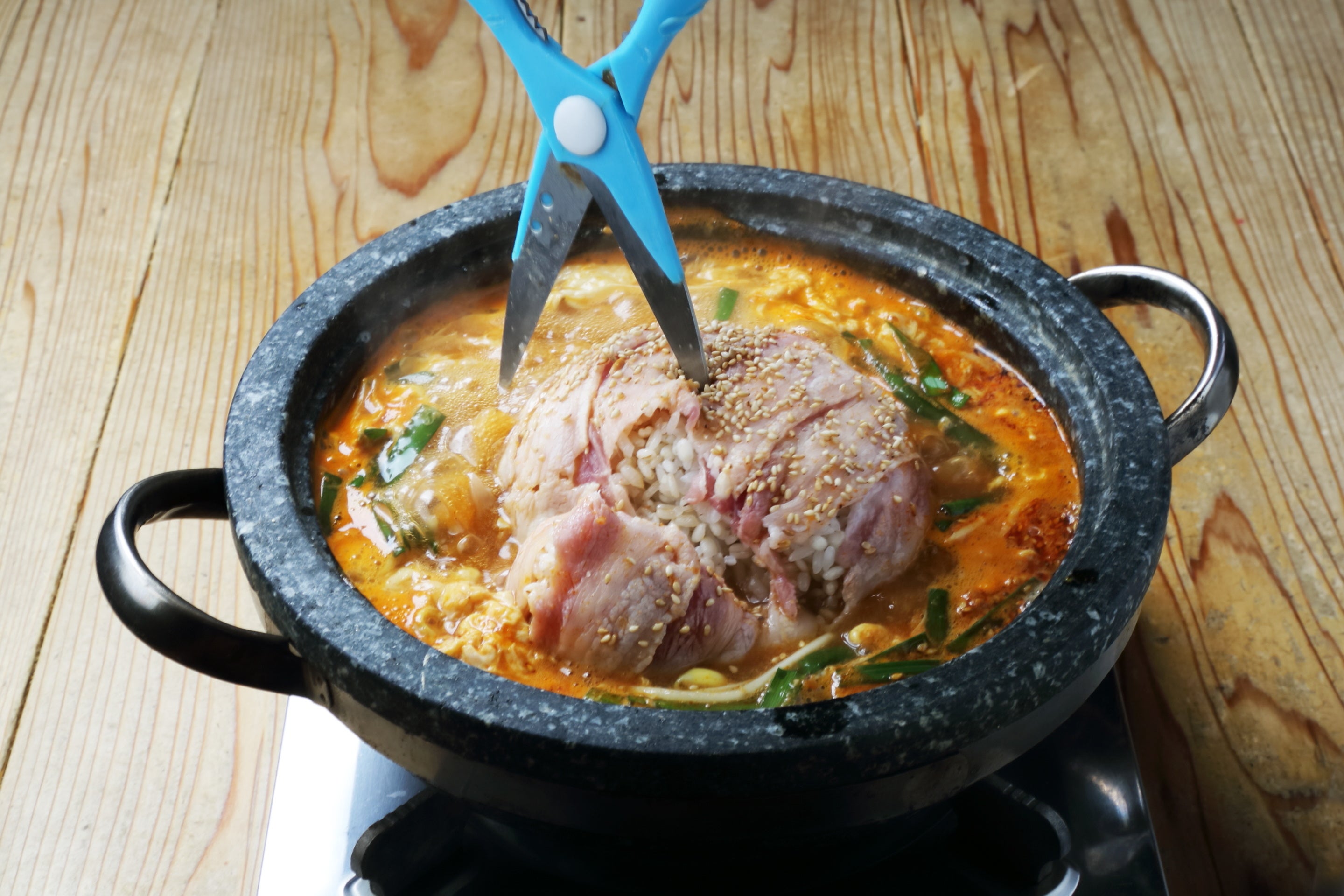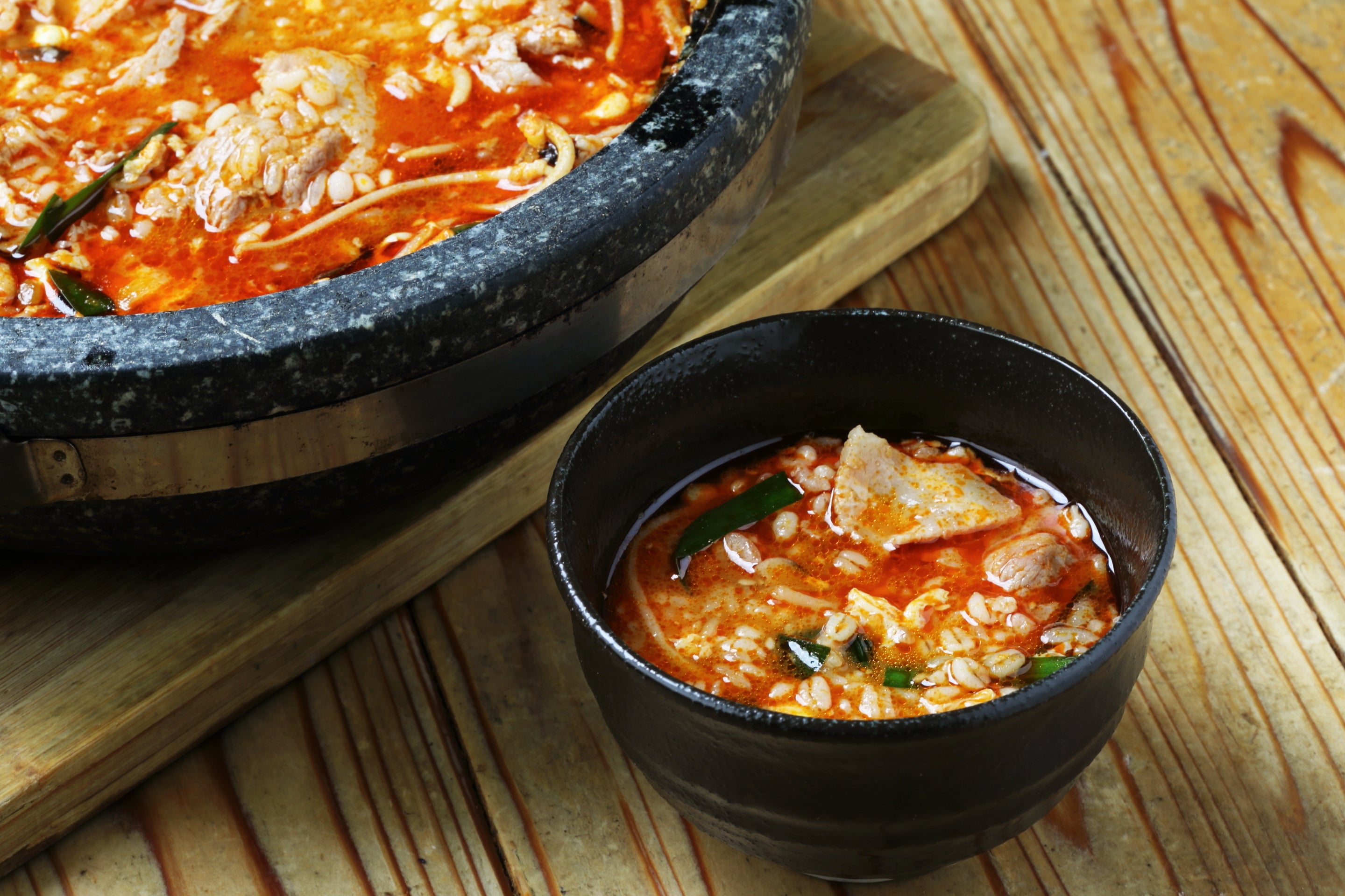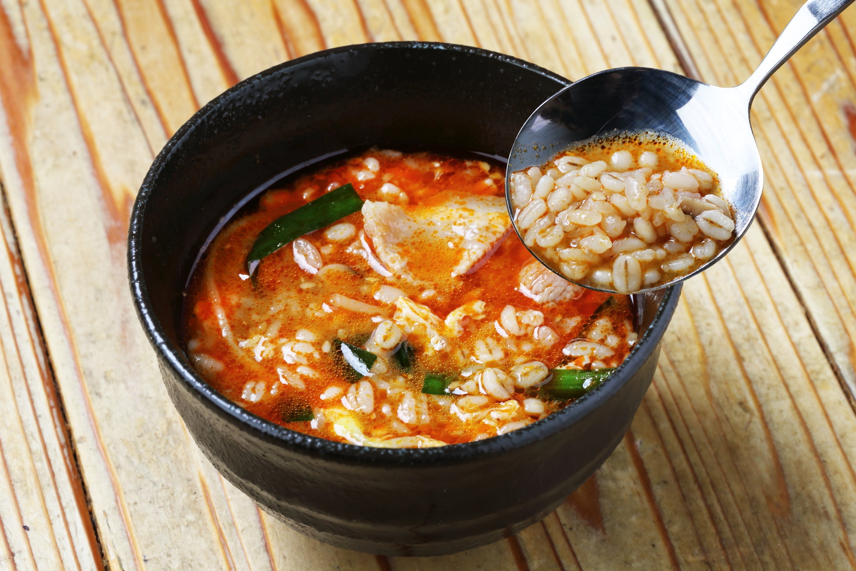 「押麦の入ったポッサムポークのユッケジャンクッパ」