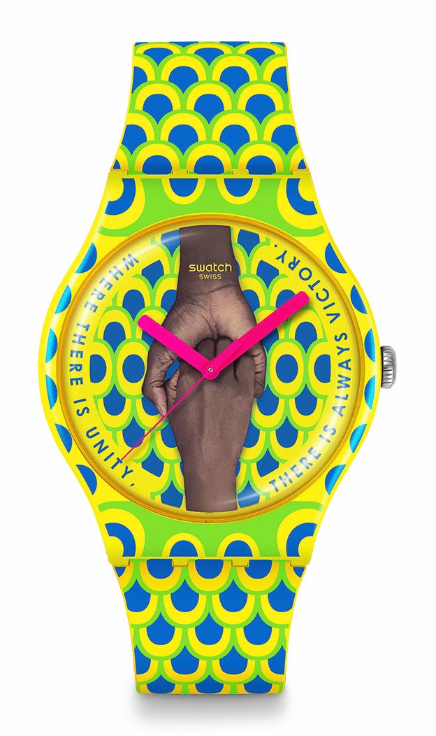 アーティスト、Thandiwe Muriuの作品は、「団結」からインスパイアされています。スポーツ、アート、音楽の3つの要素の融合、人々を結びつけるストリートカルチャーの魔法のような瞬間は「Where there is unity there is always victory」(団結あるところに必ず勝利あり)という格言を思い出させ、文字盤にはこの言葉がプリントされています。伝統的な織物からインスパイアされたプリントスタイルを背景にして手をつないだ写真が、41mmのNEW GENT BIOSOURCEDモデルに描かれた彼女のユニークな作品に色彩と動きを与えています。