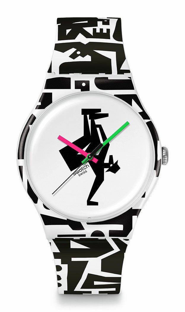 Groteskは本名Kimou Meyer(キモウ・マイヤー)。スイス出身ですが、アメリカ在住で活動しています。彼は1984年大会に参加したブレイカーたちからインスピレーションを得て、41㎜のNEW GENT BIOSOURCEDモデルに12の基本ムーブを再現しました。FREEZE TIMEという名前は、ブレーカーがムーブを一瞬止めることに由来しており、文字盤はそのフリーズをモチーフとしていて、ストラップにも似たようなキャラクターがほかのムーブを再現している様子が描かれています。ブラックとホワイトの配色は、Swatch World Breakdance ChampionshipのためにKeith Haringが制作したオリジナルポスターにインスパイアされたカラフルな針と強烈なコントラストをなしています。