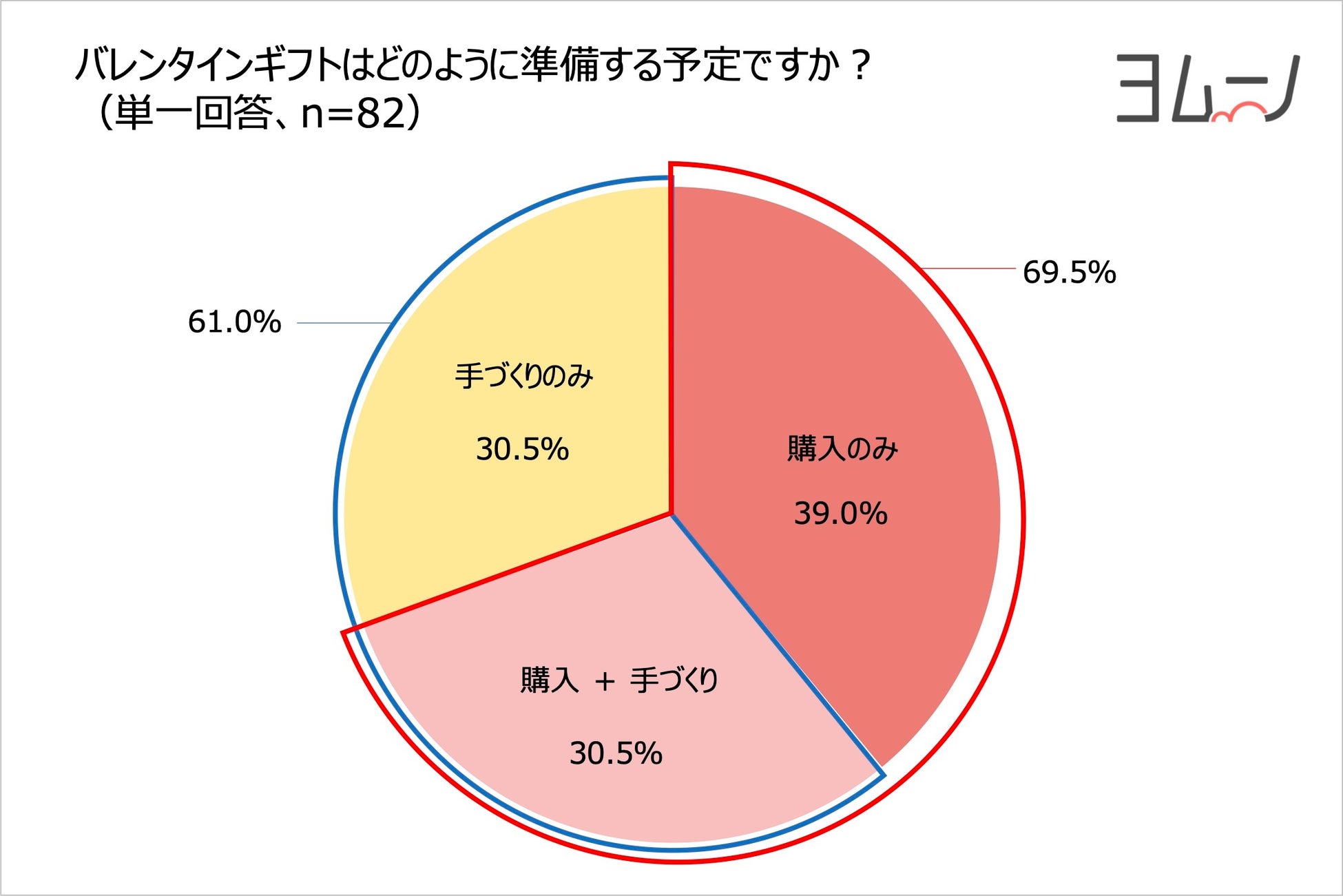 バレンタインギフトの準備について尋ねたところ、購入する予定の方は69.5%となりました。また、「購入するが手づくりもする」方を含め、「手づくりする」と回答した方は61.0%となりました。