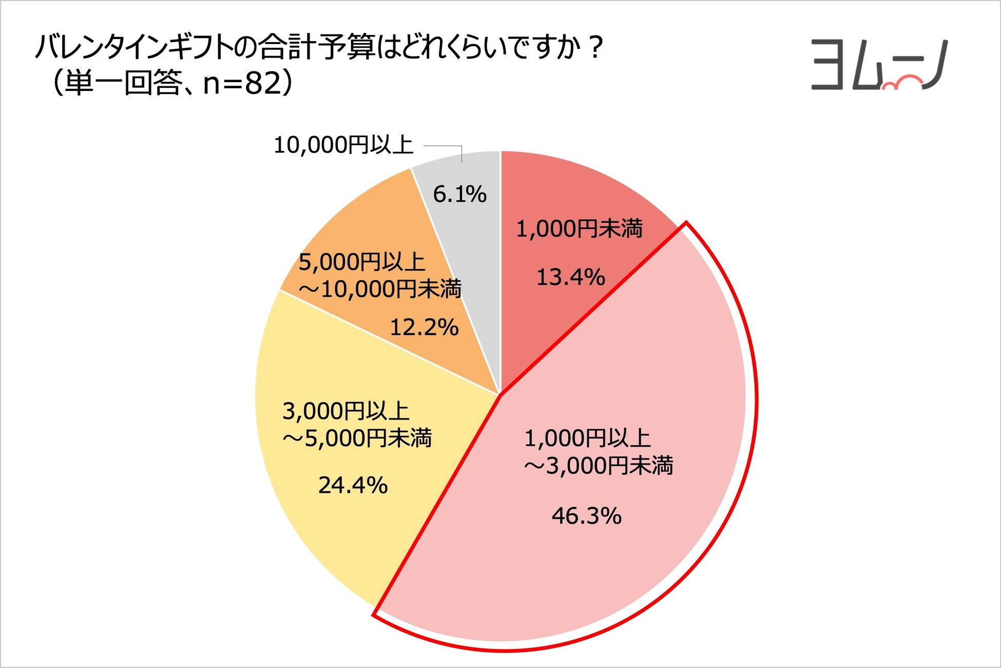 バレンタインギフトにかける予算総額を聞いたところ、「1,000円以上〜3,000円未満」との回答が46.3%で最多となり、次いで「3,000円以上〜5,000円未満」が24.4%となりました。また、平均は3,400円となりました。