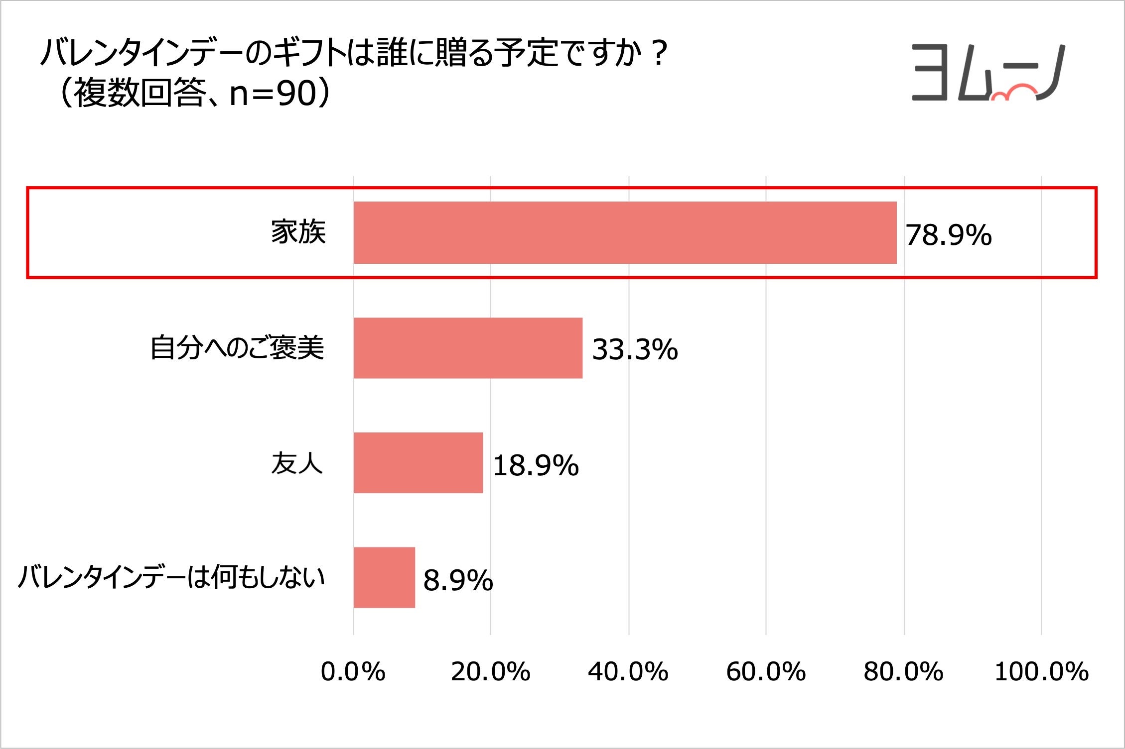 今年のバレンタインについて、全体の9割超が「ギフトを贈る」と回答し、ギフトを贈る相手は「家族」との回答が78.9%で最多となりました。多くの家庭がバレンタインを家族で楽しむ予定であることがわかりました。