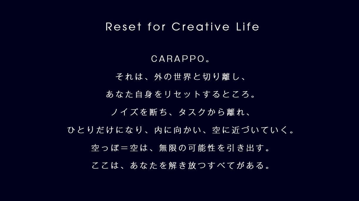 CARAPPOは、“Reset for Creative Life”というコンセプトのもと、トレーニング、サウナ、メディテーション(瞑想)を体験し、心身共にリフレッシュした“空っぽ”な状態になれる総合ウェルビーイング施設です。