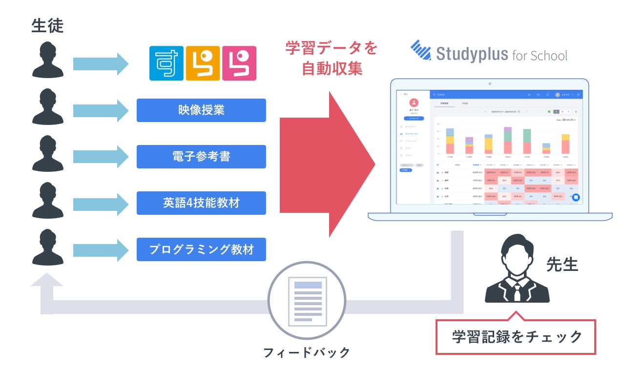 今回の「Studyplus for School SYNC」を通じたデータ連携によって、「すらら」の学習データが自動的に「Studyplus for School」に連携されます。