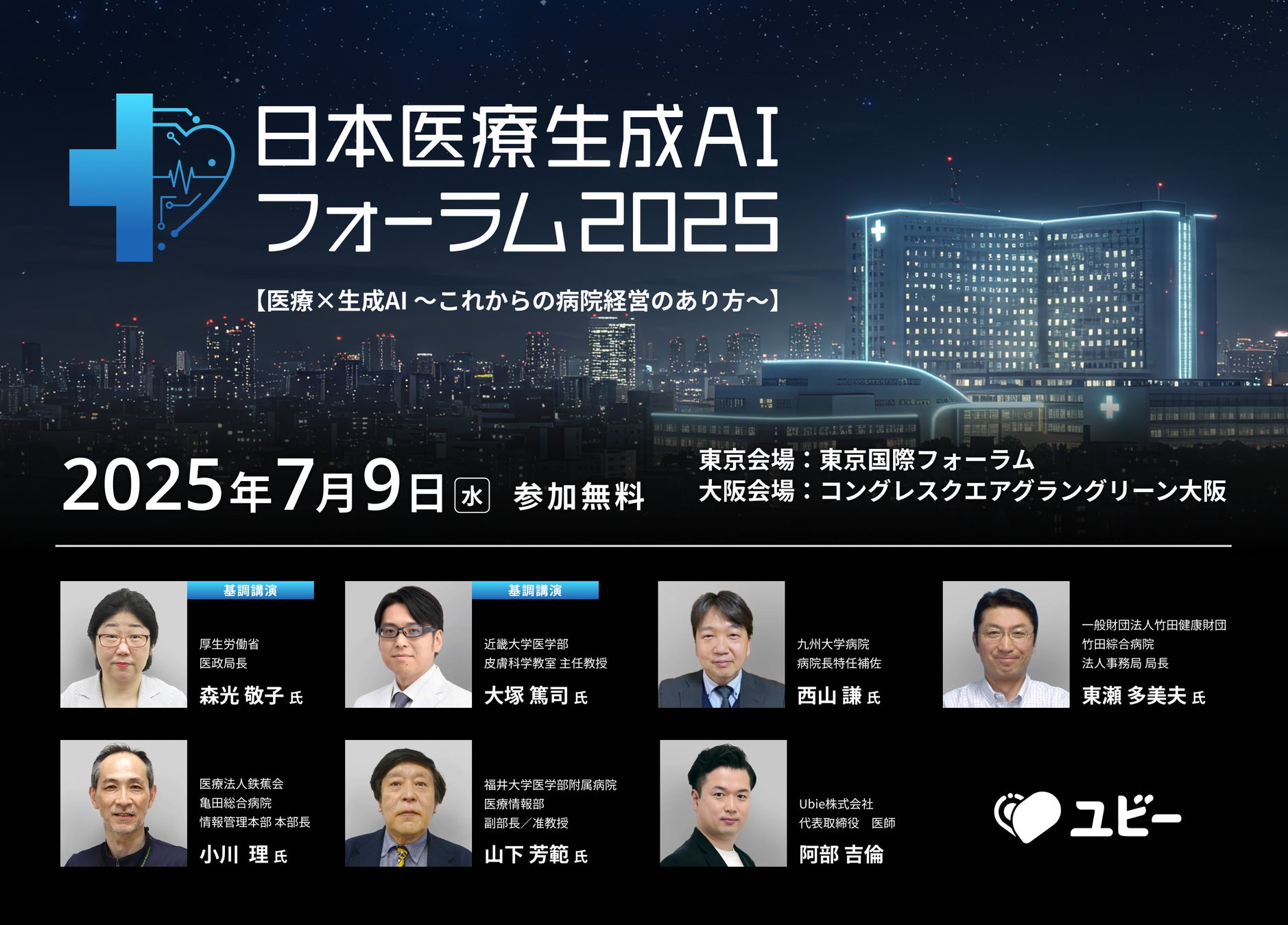 Ubie株式会社(本社:東京都中央区、共同代表取締役:阿部吉倫・久保恒太)が実行委員長として推進する病院経営者様向けカンファレンス「日本医療生成AIフォーラム2025」(2025年7月9日 東京・大阪にて開催)の全登壇者が決まりました。